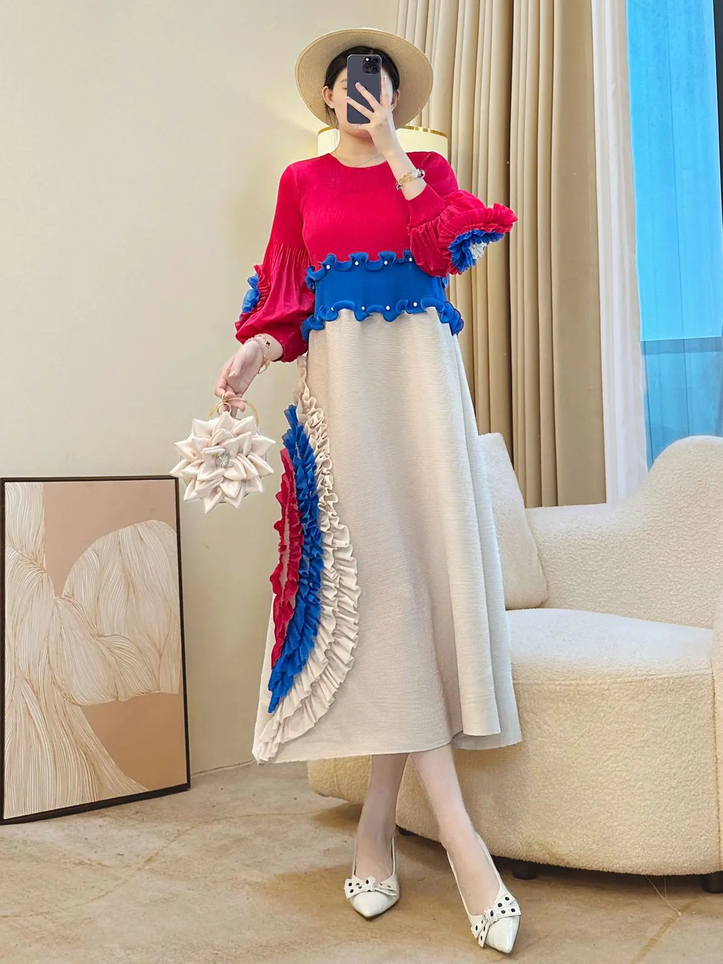 Miyake Yichuang Solid Casual Natural Waistline Women's 2026 Autumn French Elegant Midi A-Line Dress