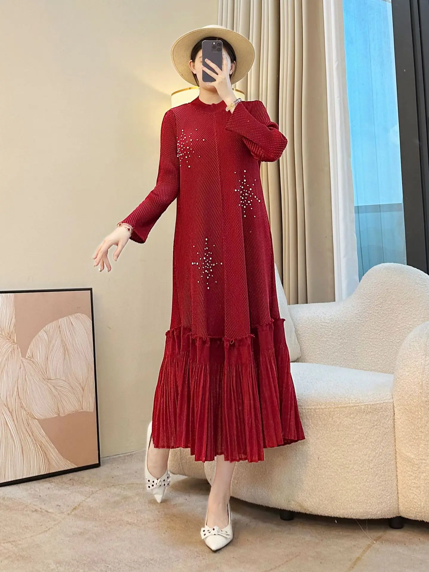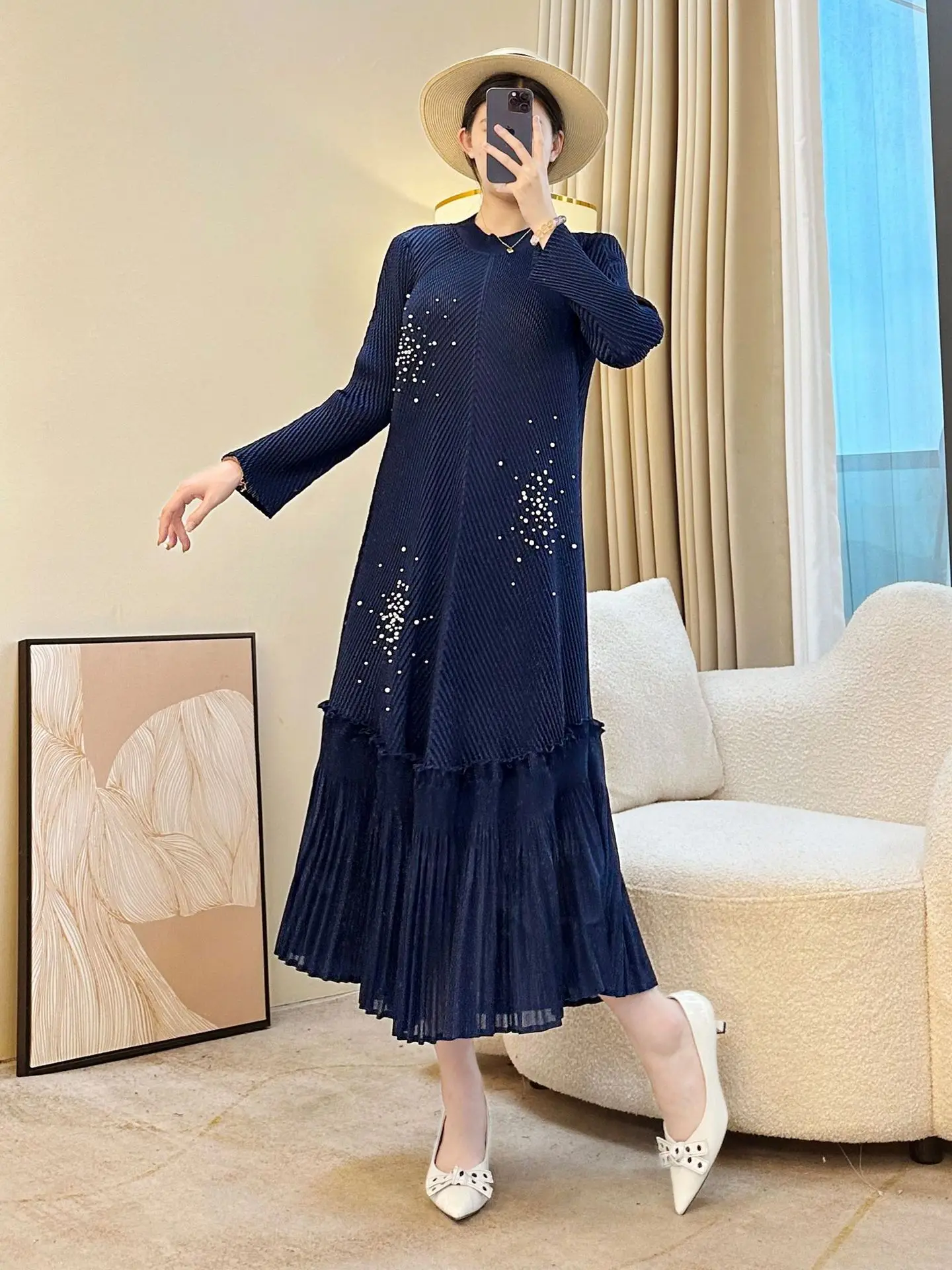 High-grade Green Miyake Casual Chiffon Dress Long-sleeved Spring Autumn Thin Straight Skirt Slimming Elegant Natural Waist
