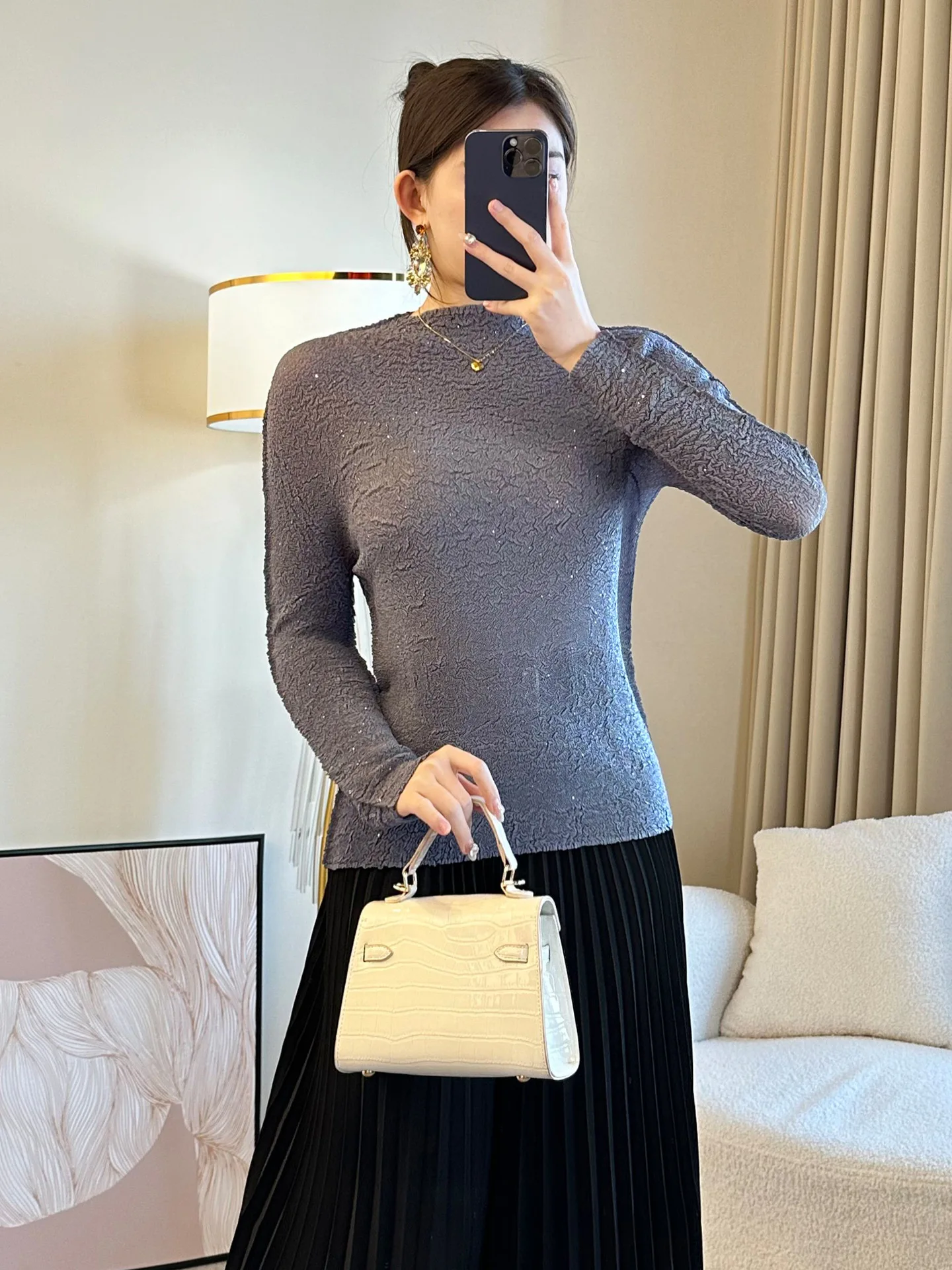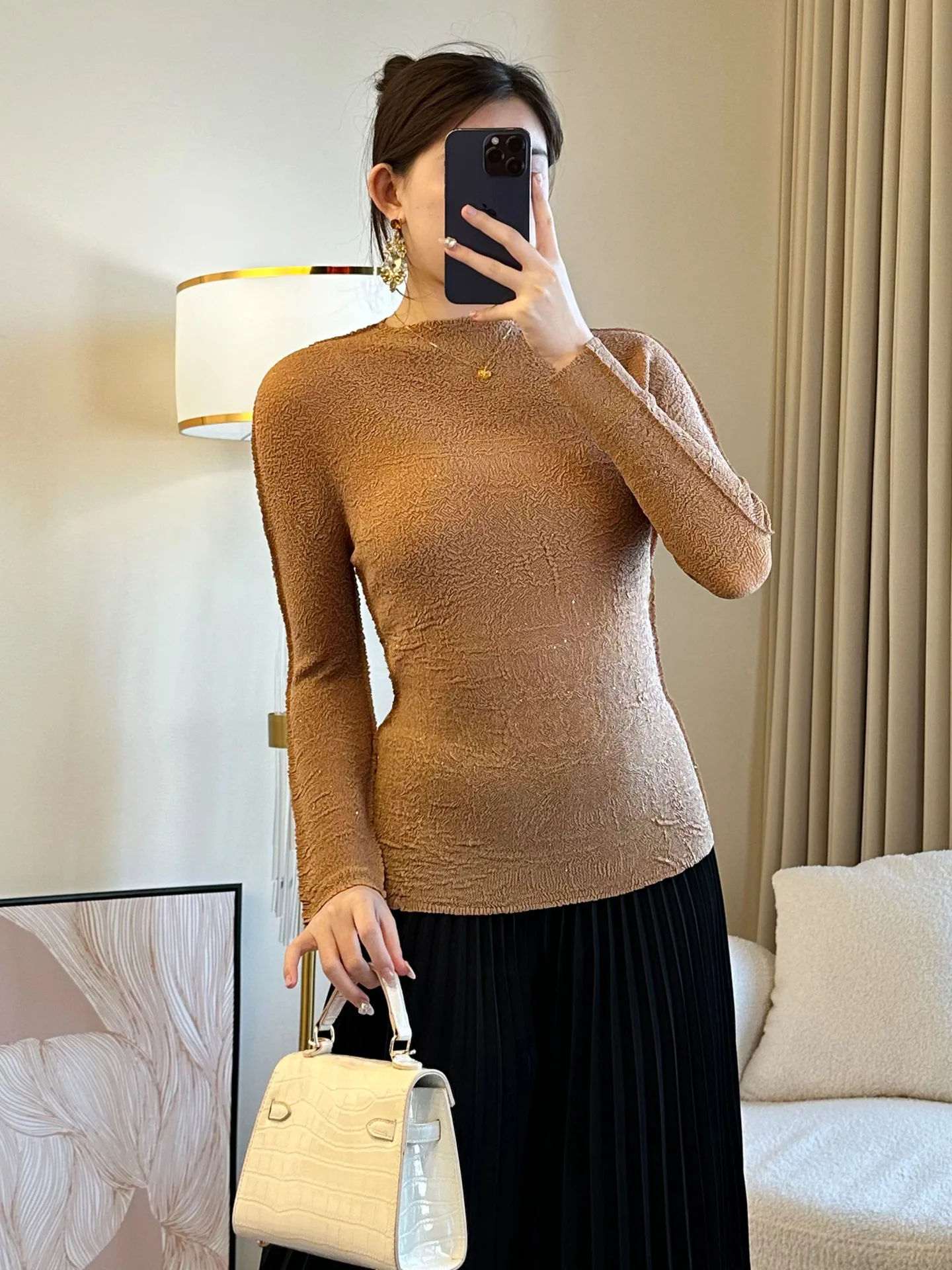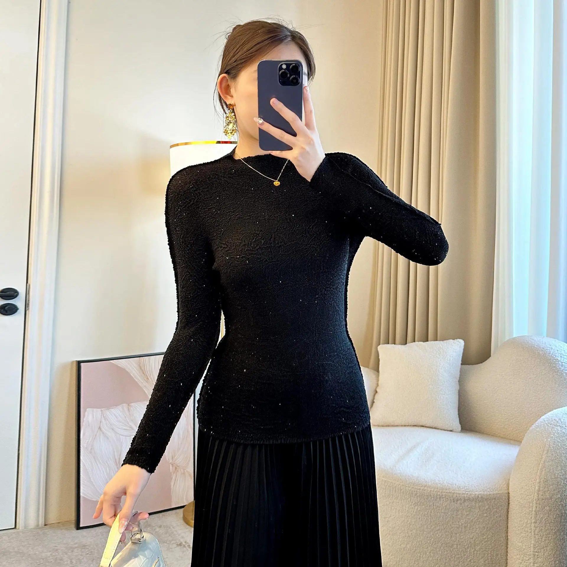2026 New Arrival Large Size Joker Fashion Slim Long Sleeve Base Shirt Solid Casual Pleated Spring Top Top Fashion Temperament