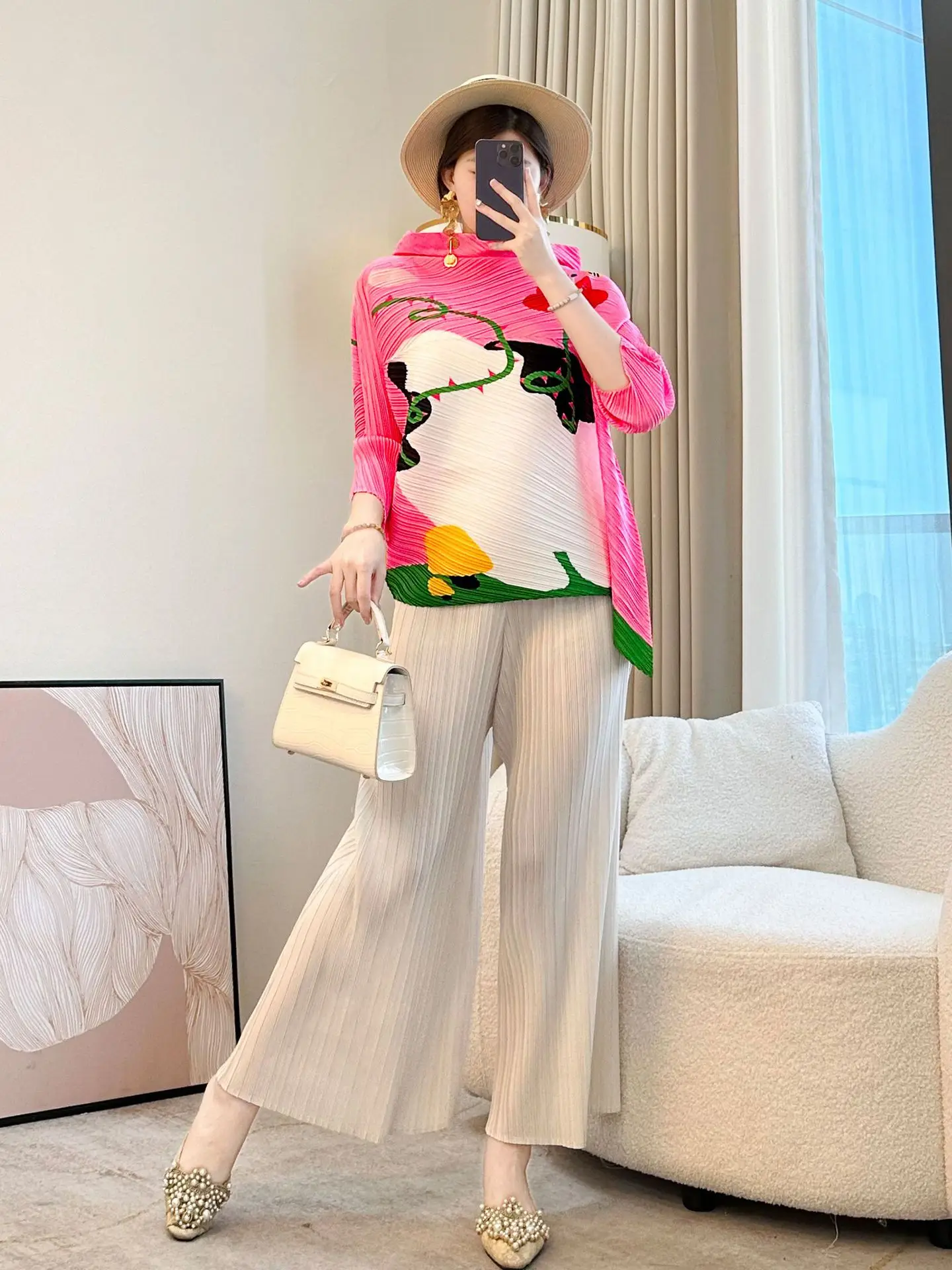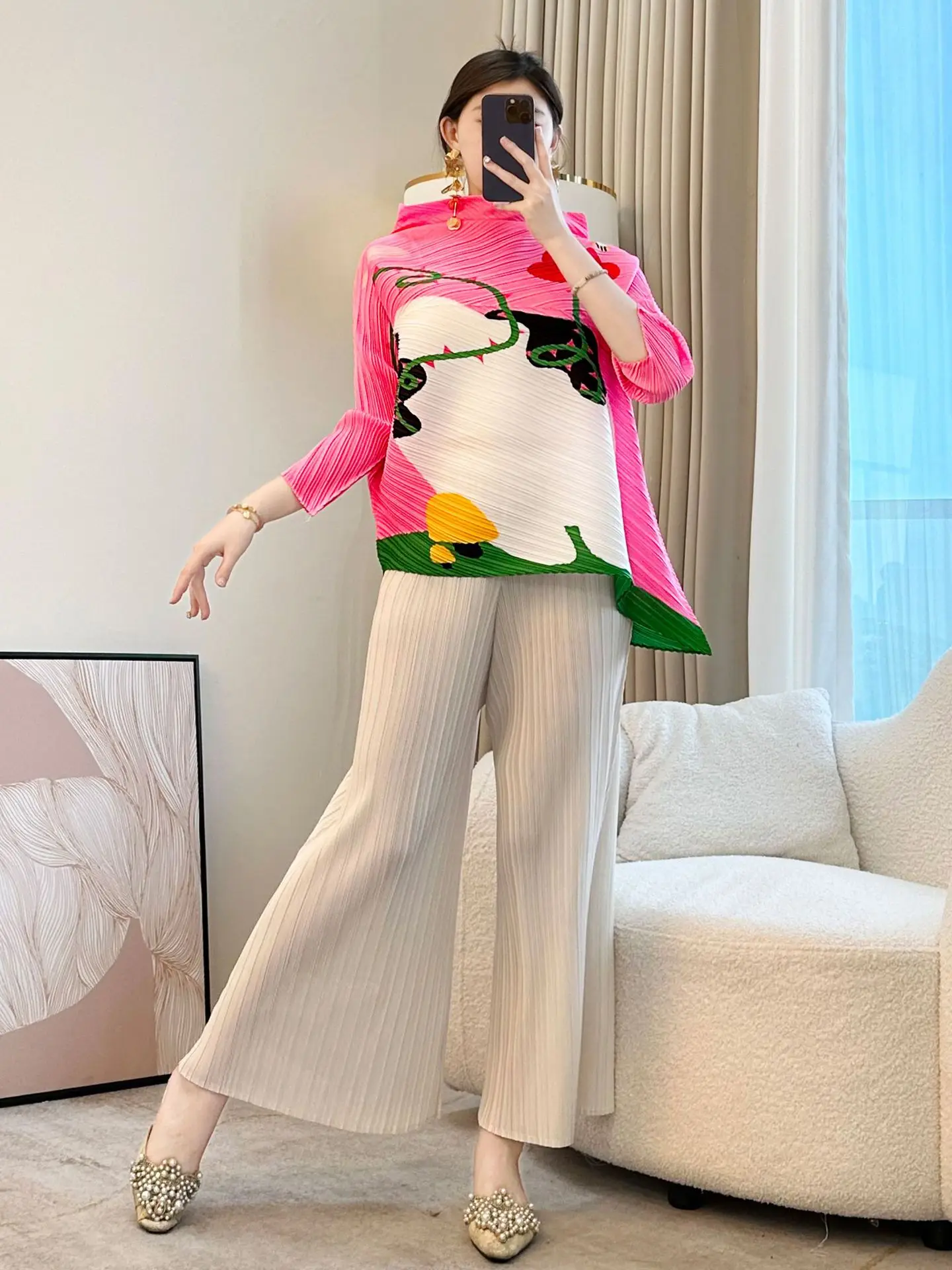 2026 Summer New Fashion Color Matching Printed Seven-Sleeve T-Shirt Casual Pink All-Match Loose Pleated Top for Women