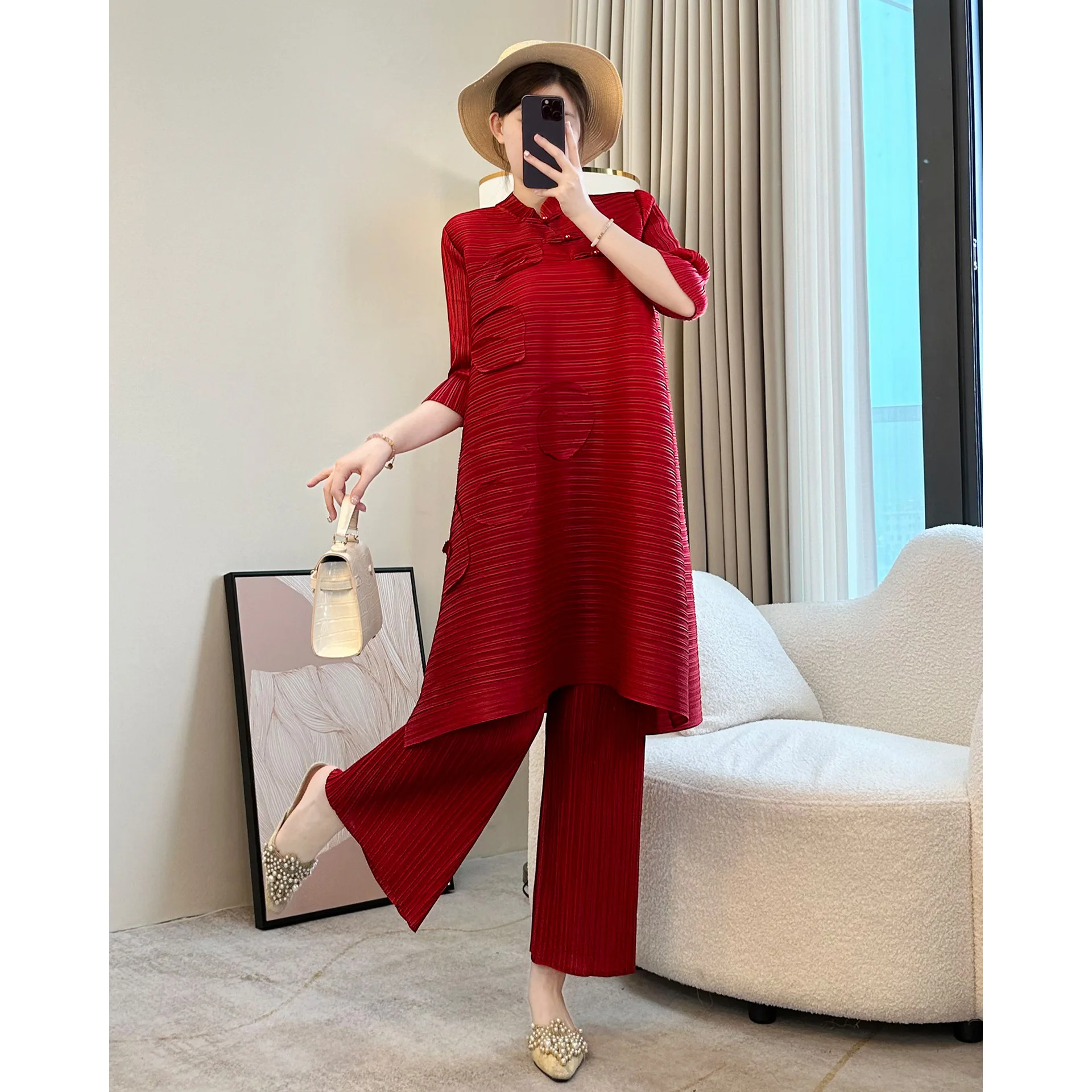 Miyake Women's Mid-Length Dress Simple Casual Summer Solid Color Western Style Age Reduction Pleated Trumpet Sleeve for Spring