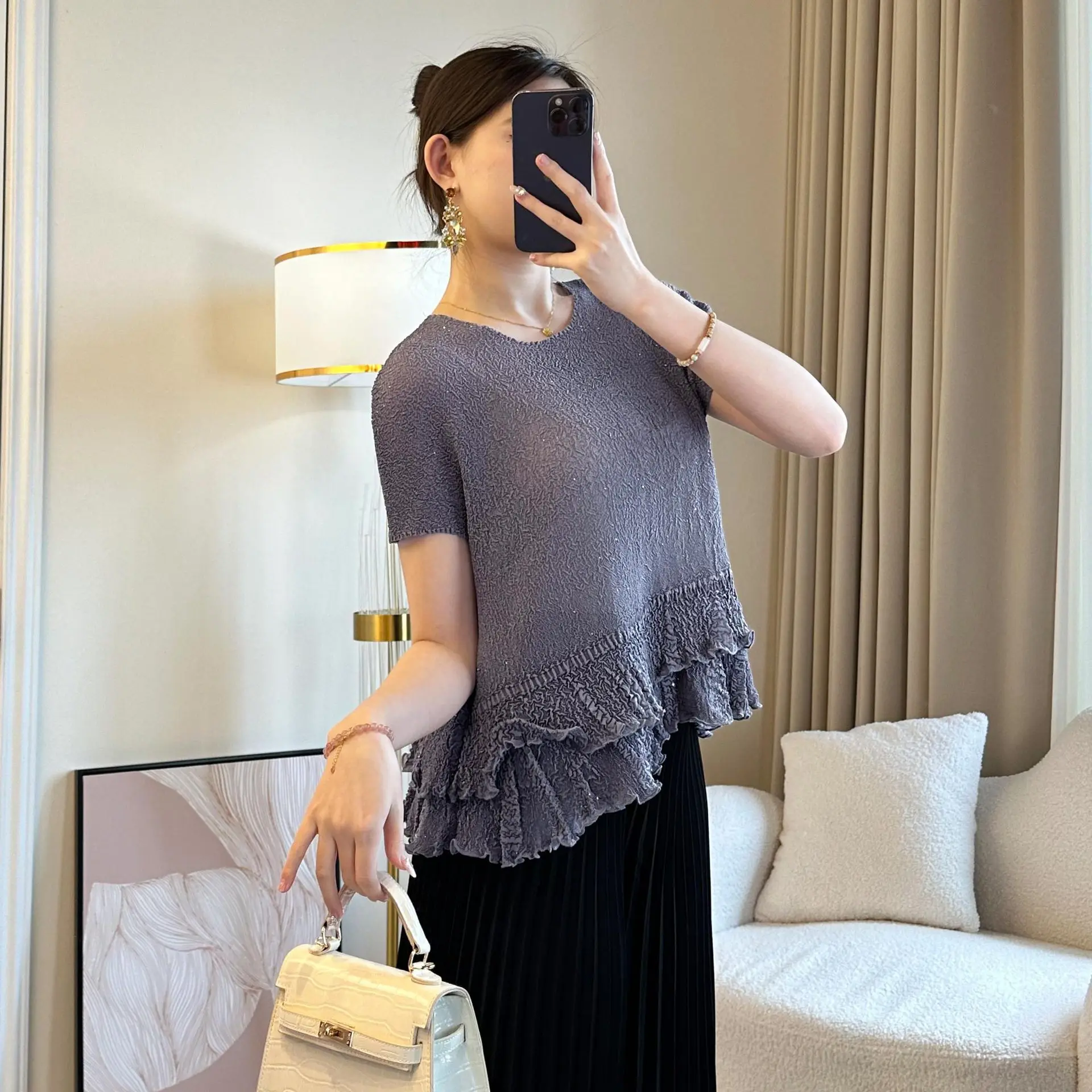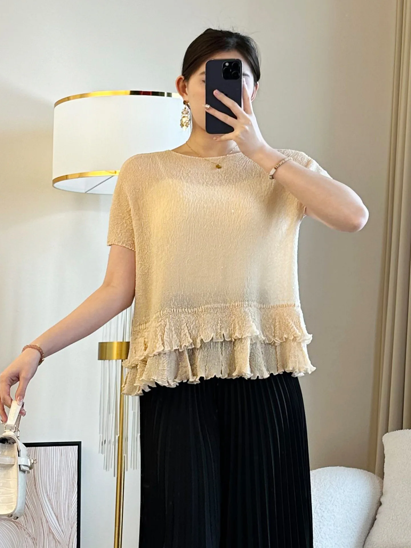 2026 Summer New Elegant Pleated Top with Short Sleeve All-Match Design Fashionable Knitted One-Piece Anti-Pilling Feature