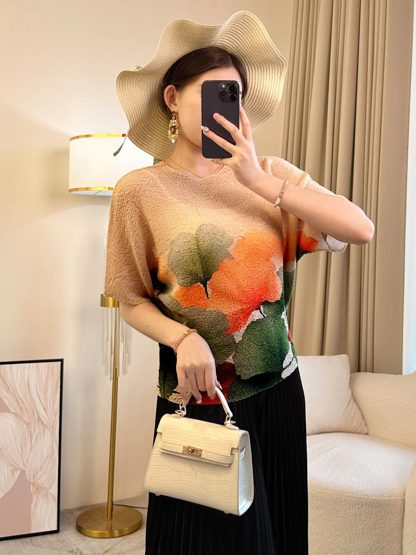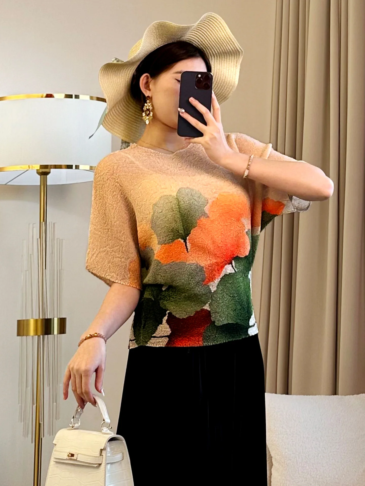 2026 Summer New Fashion Joker Top for Women Printed Pleated Crew Neck T-Shirt Loose Fit Short Length Casual Style