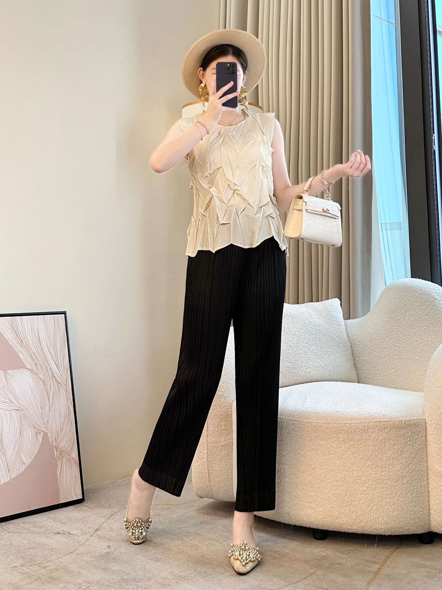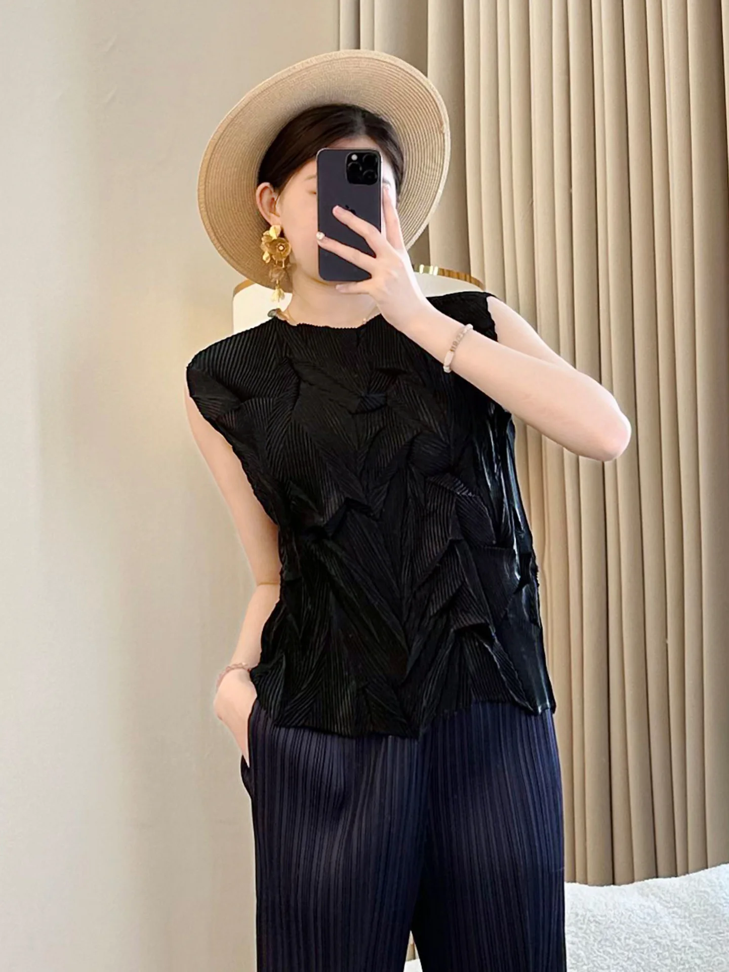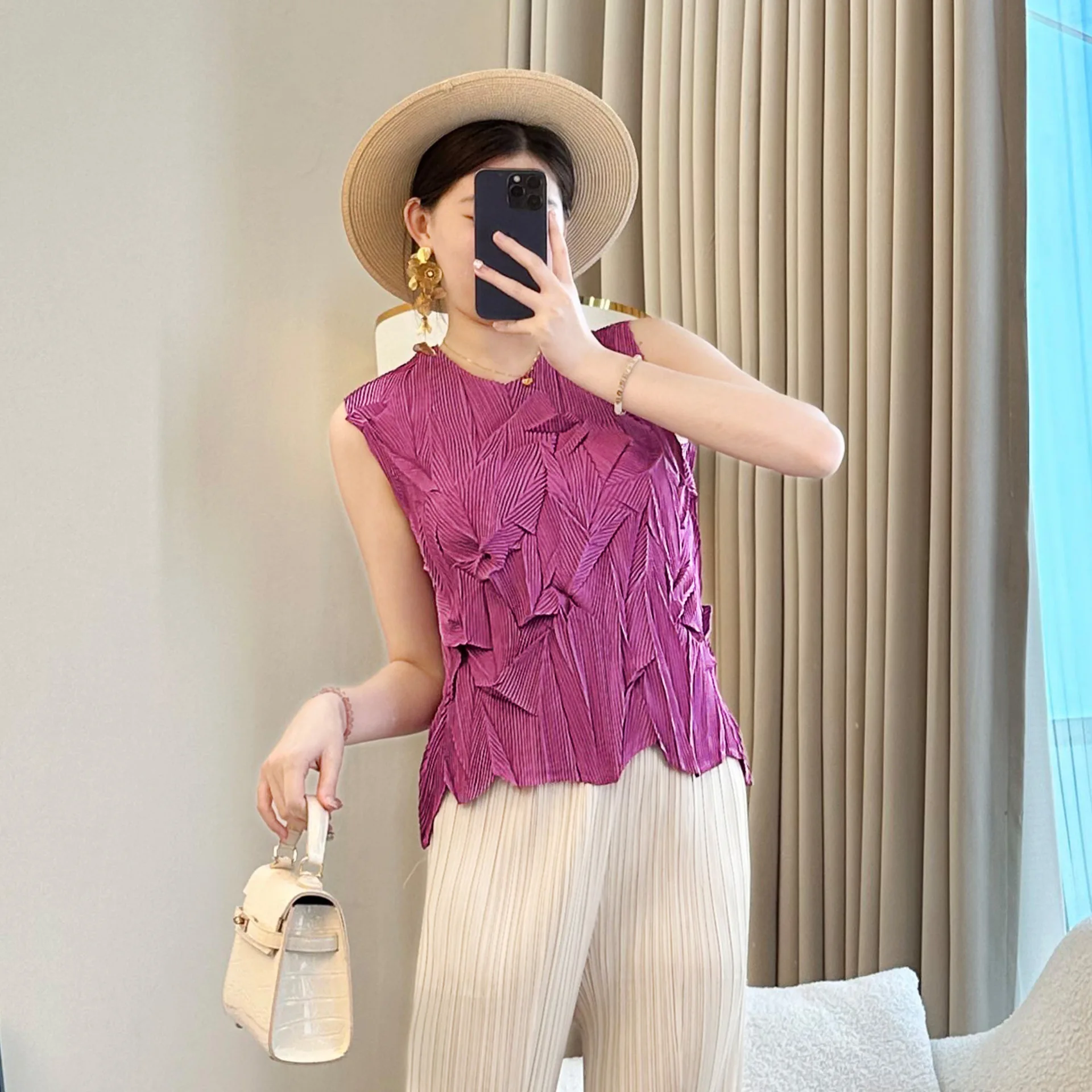 2026 Summer Chic Women's Purple Vest New Fashion Slim-Fit Pleated T-Shirt Round Neck Design Made of Polyester Knitted Fabric