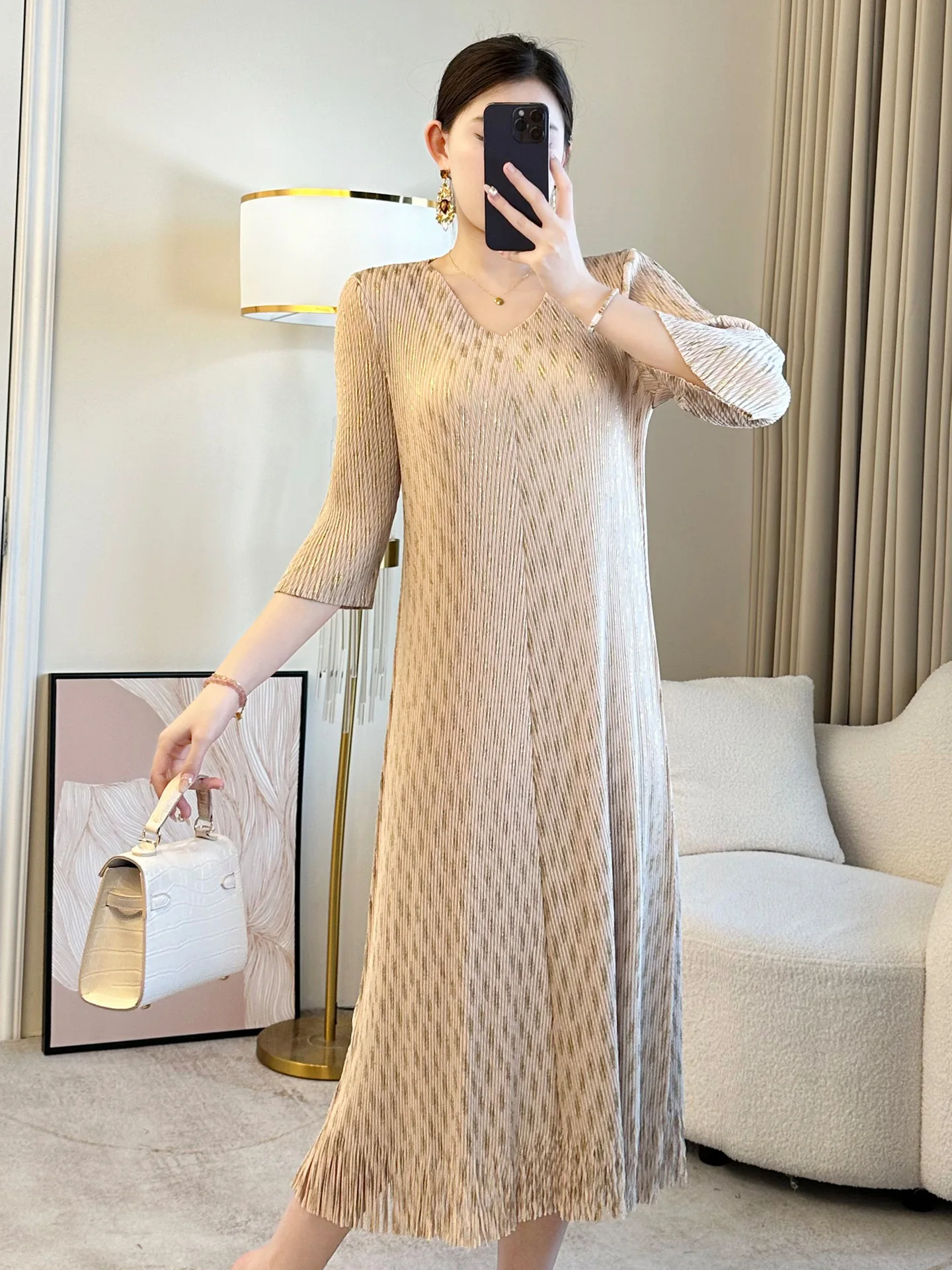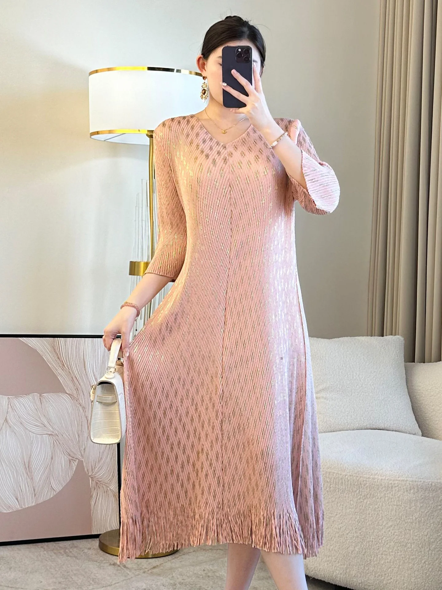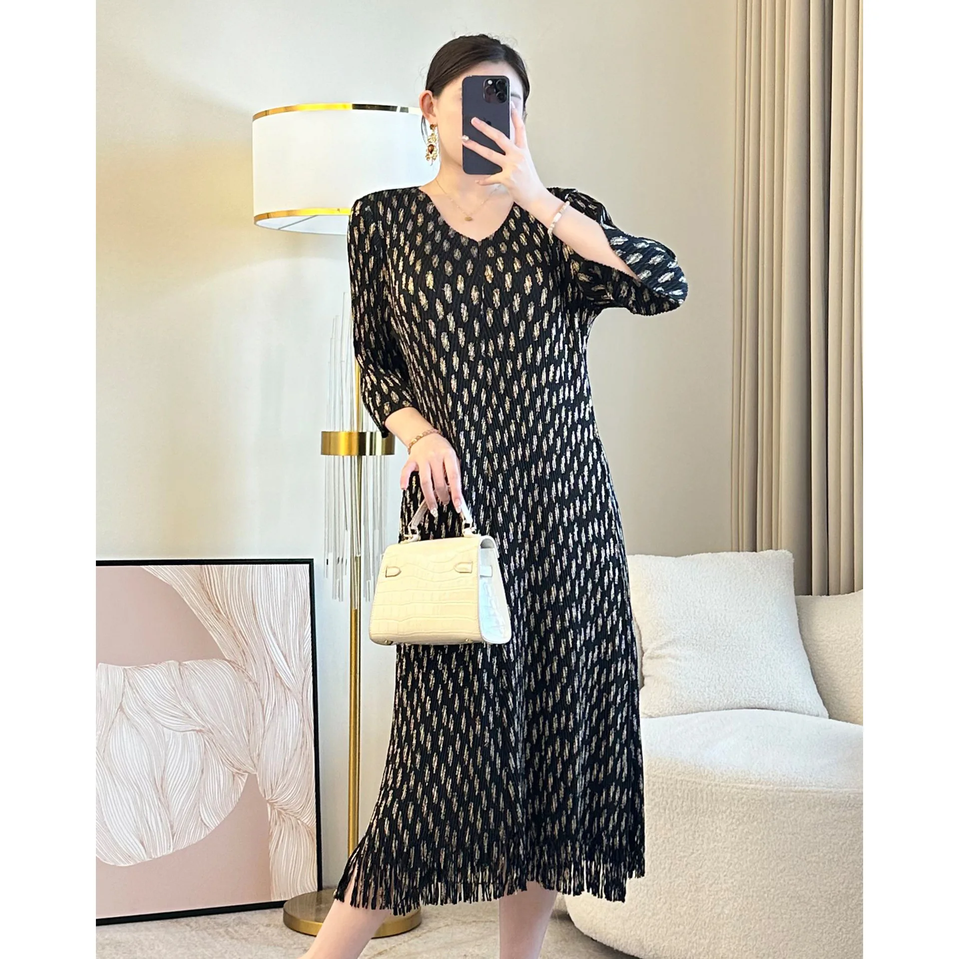 2026 Summer New Miyake Pleated V-Neck Dress Elegant Floral-Print Loose Skirt Tassels 100% Cotton Casual Woven Generation Hair