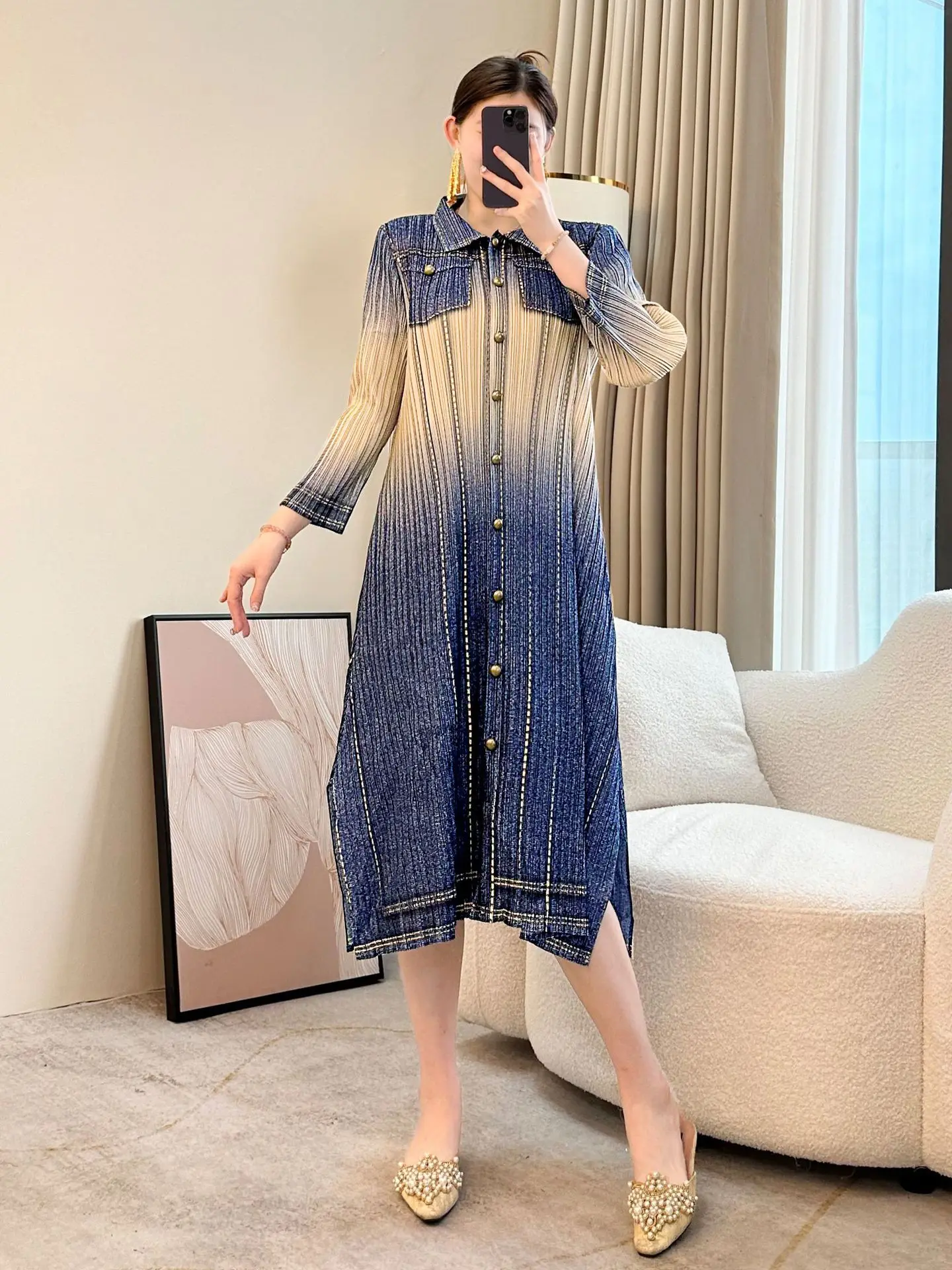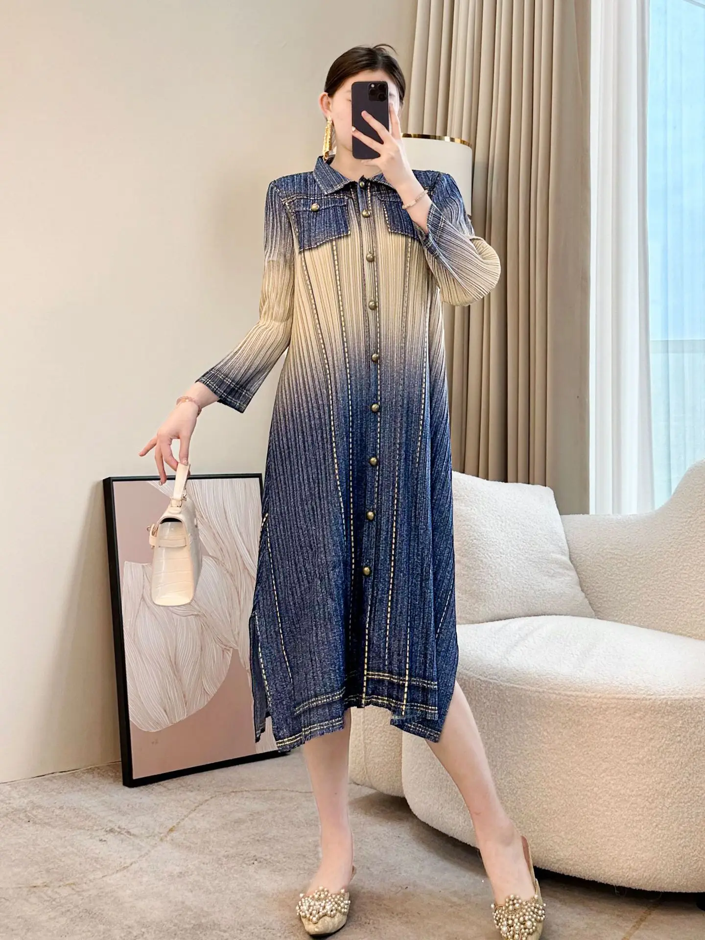 2026 Generation Spring Summer New Pleated Fashion Age-Reducing Loose Light Luxury Denim Cardigan Dress Floor-Length Casual Print