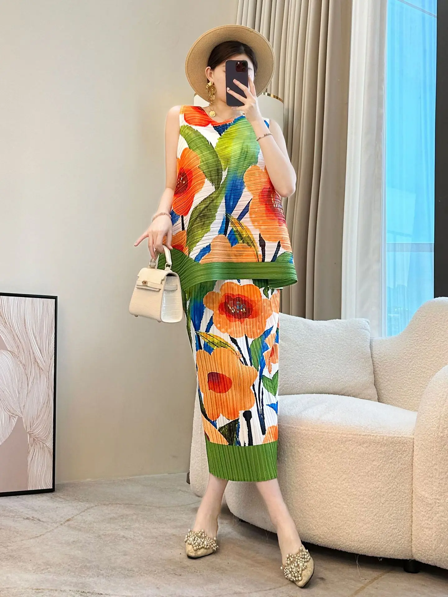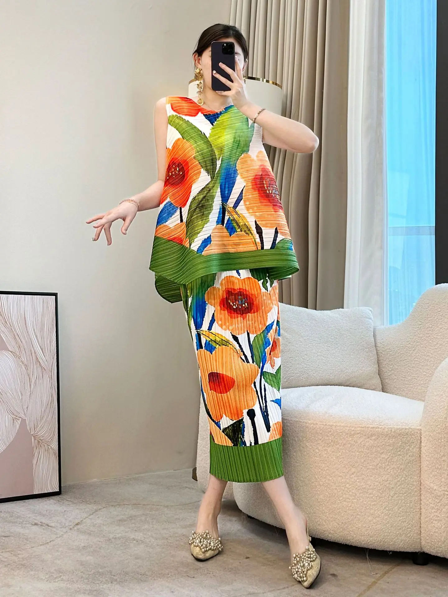 2026 Summer New Pleated Skirt Set for Women Casual French Printed Chiffon Dyed Garment Lazy Wind Two-Piece for Plus Size MM