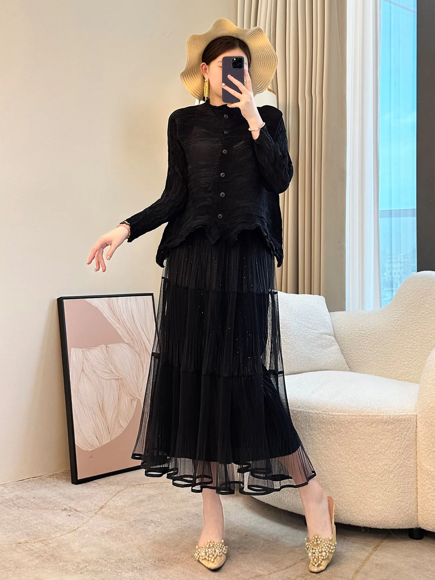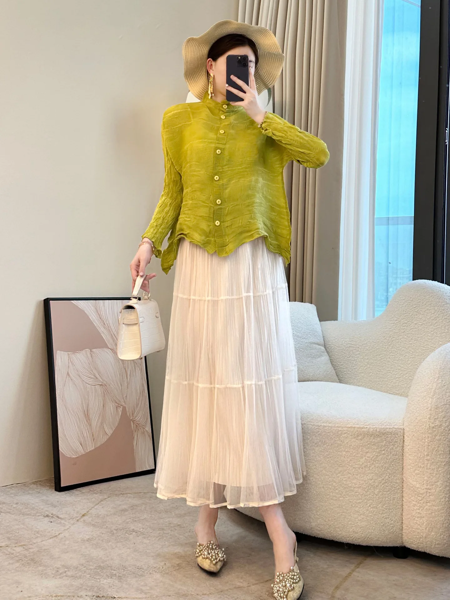 2026 Summer Fashion Elegant High-end Casual Long-sleeved Green Top for Women Loose Fit Large Size Pleated Lazy Style for Office