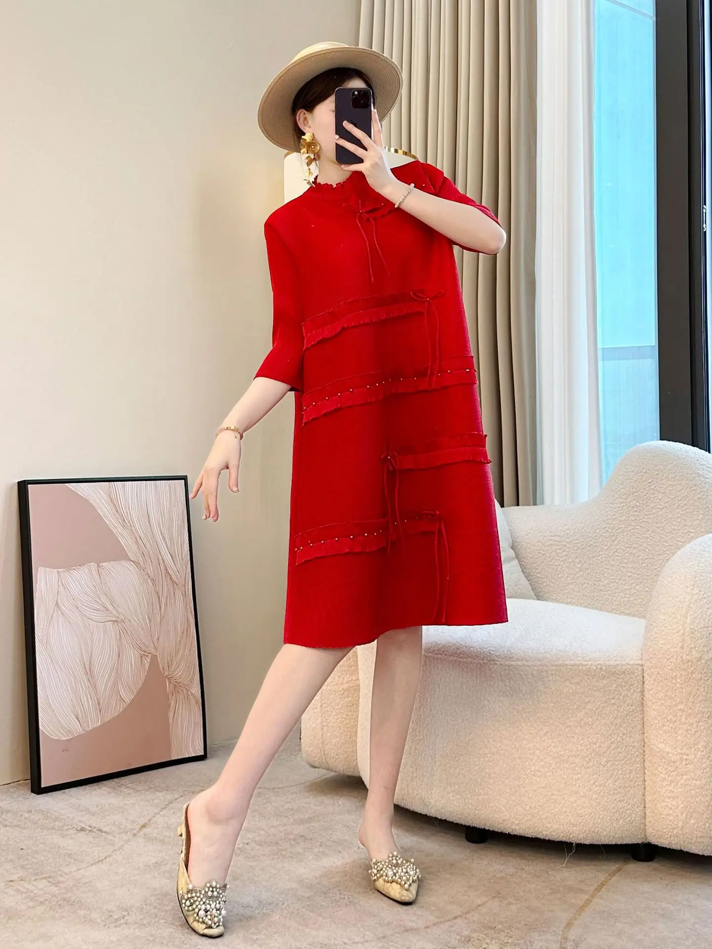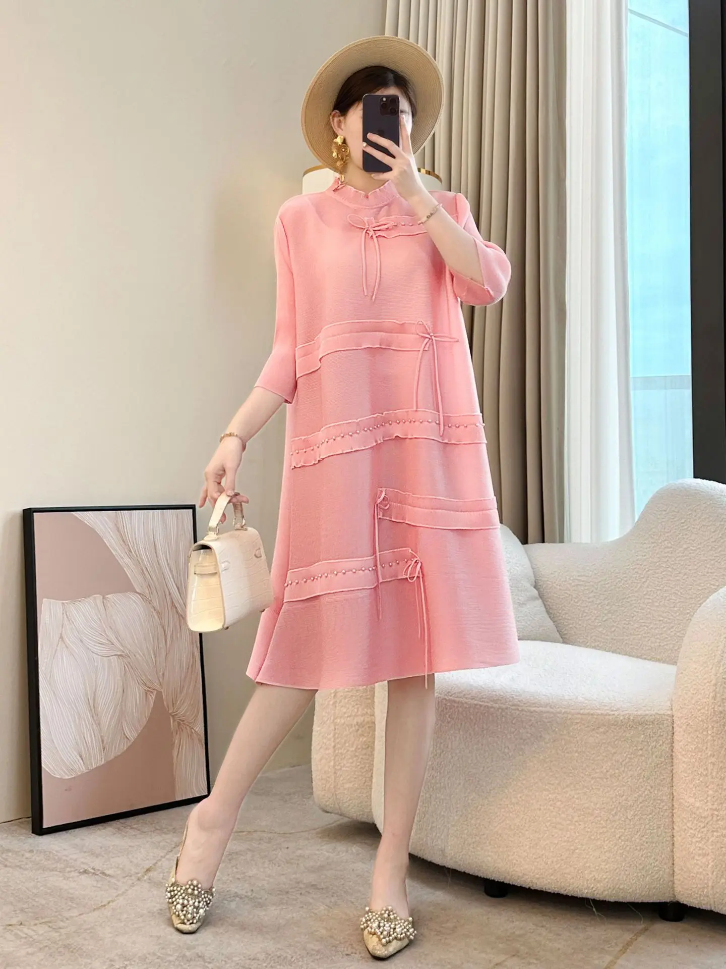2026 Elegant Pink A-Line Dress for Chubby Girls Large Size Mother's Spring Beaded Dress Lace Plain Dyed Belly Covering Dress