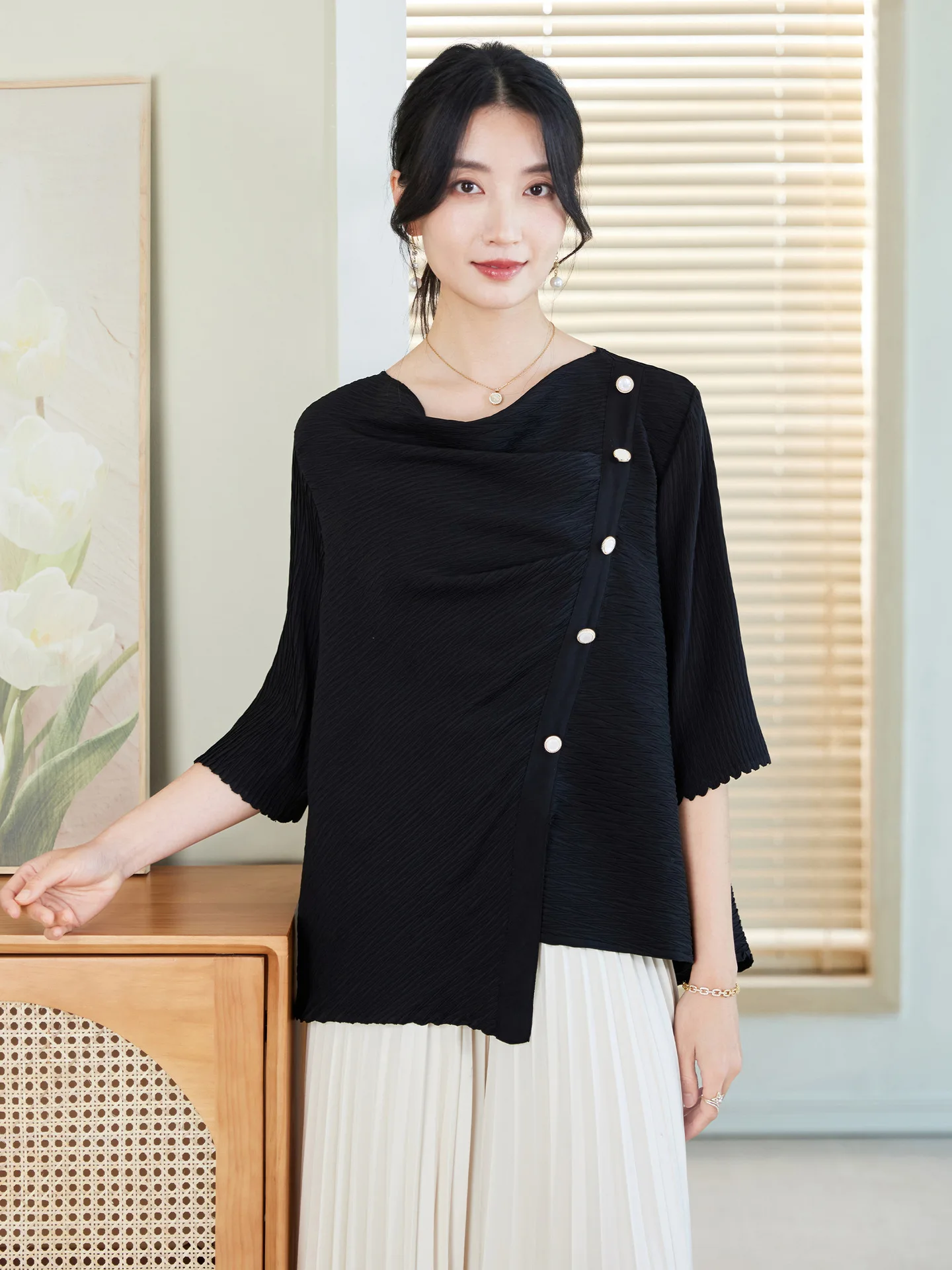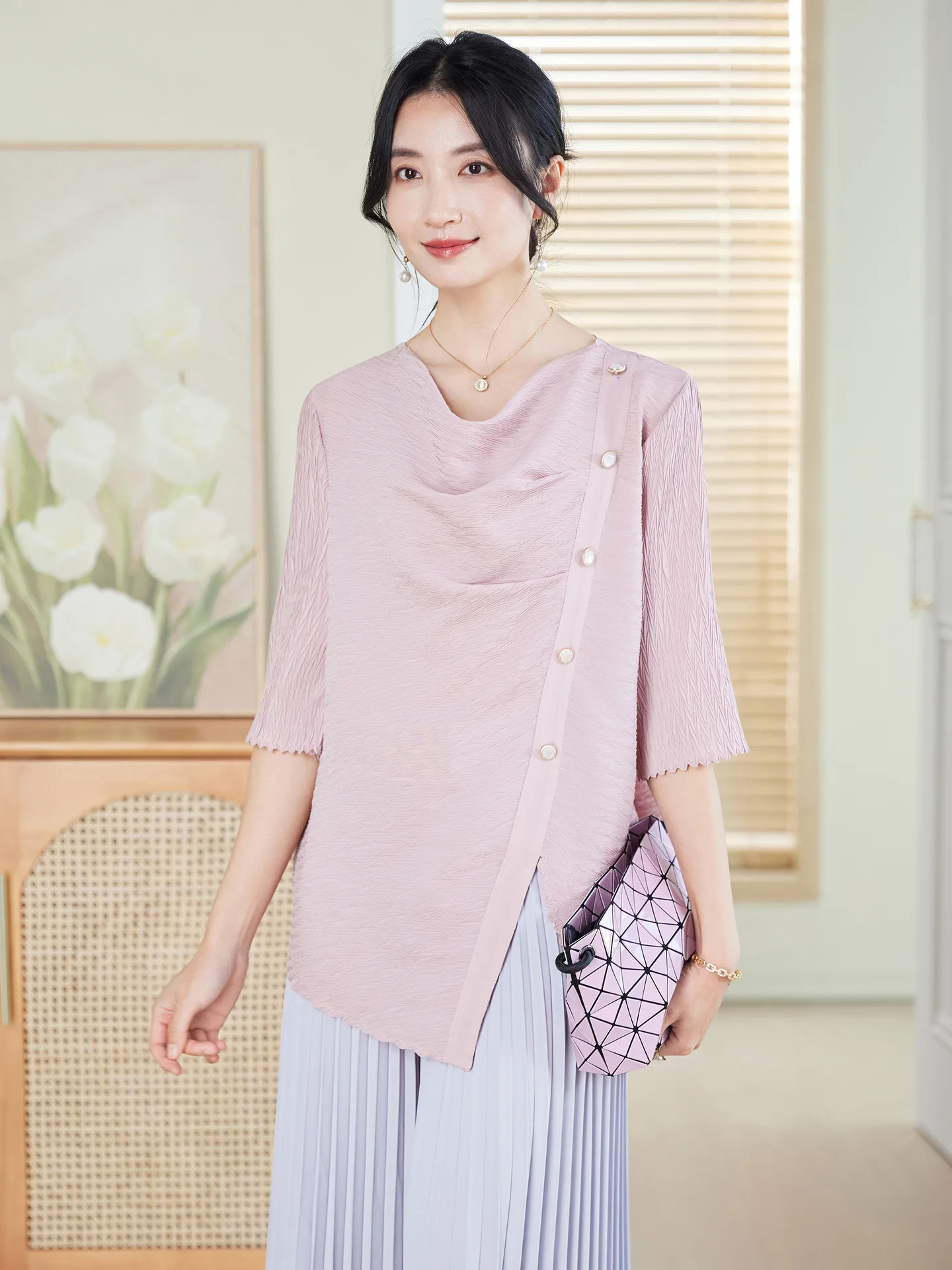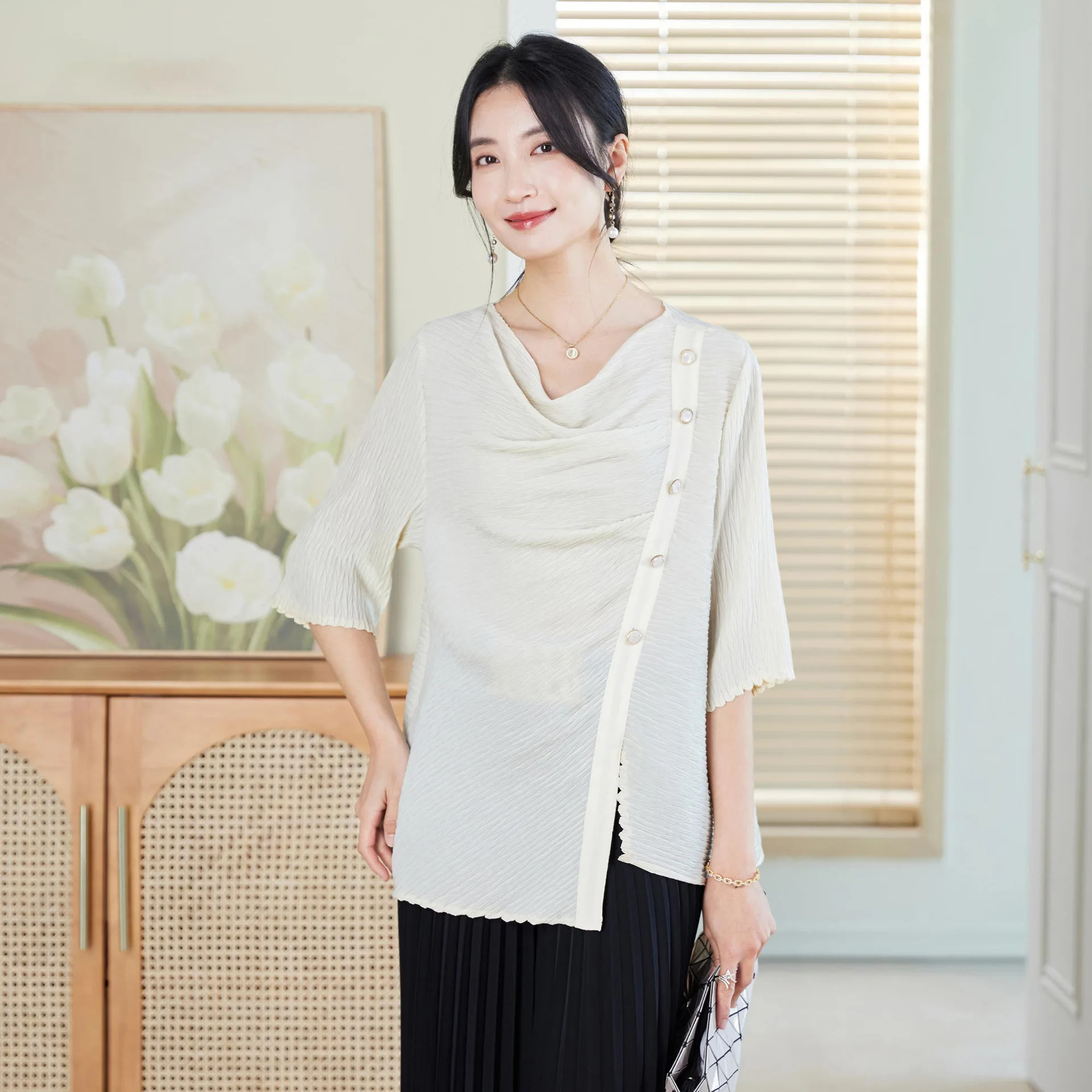 2026 Spring Summer Collection Elegant Women's Fashion Top Pleated Detail Loose Large Size Long Solid Generation Hair Inspiration