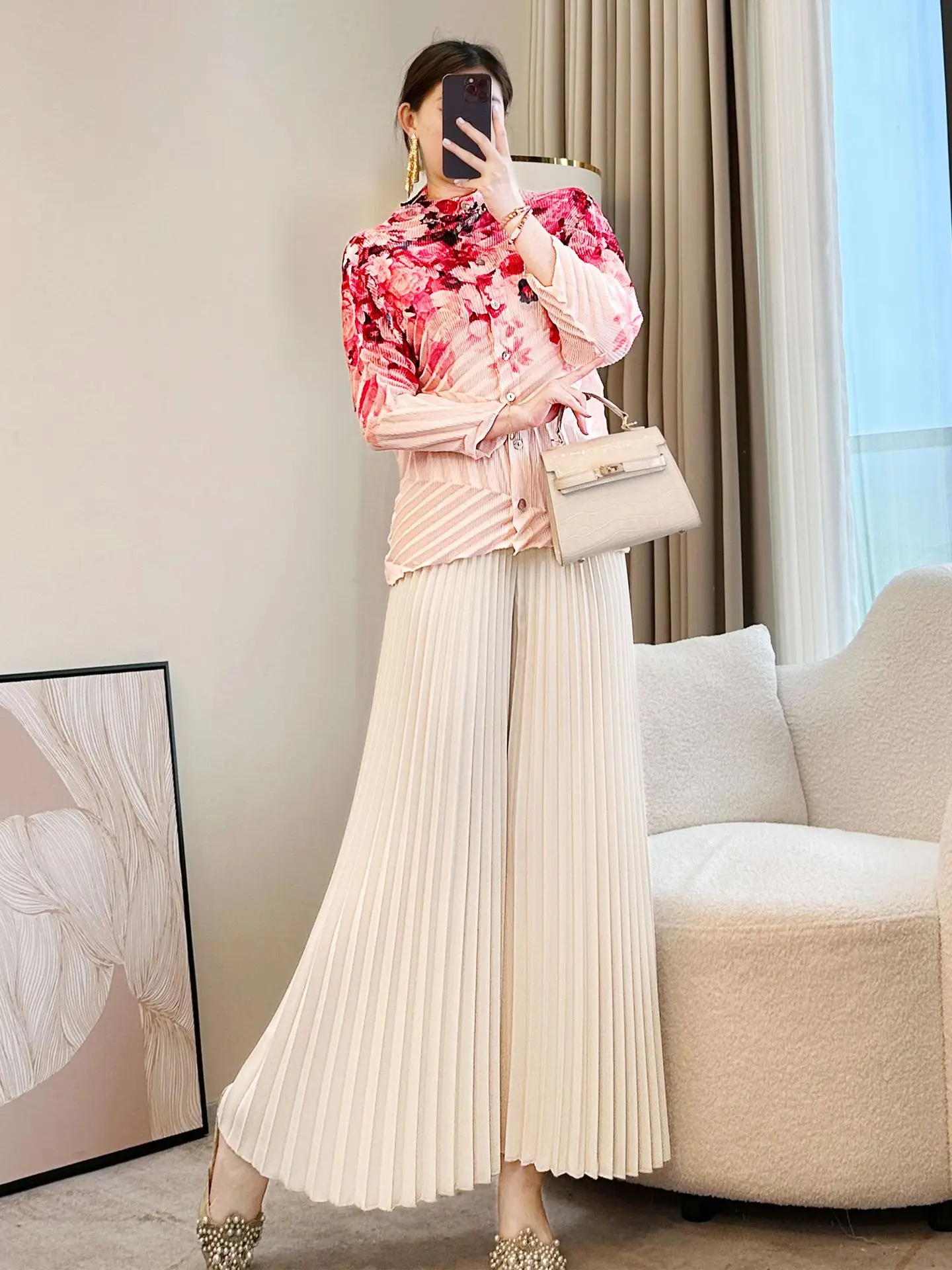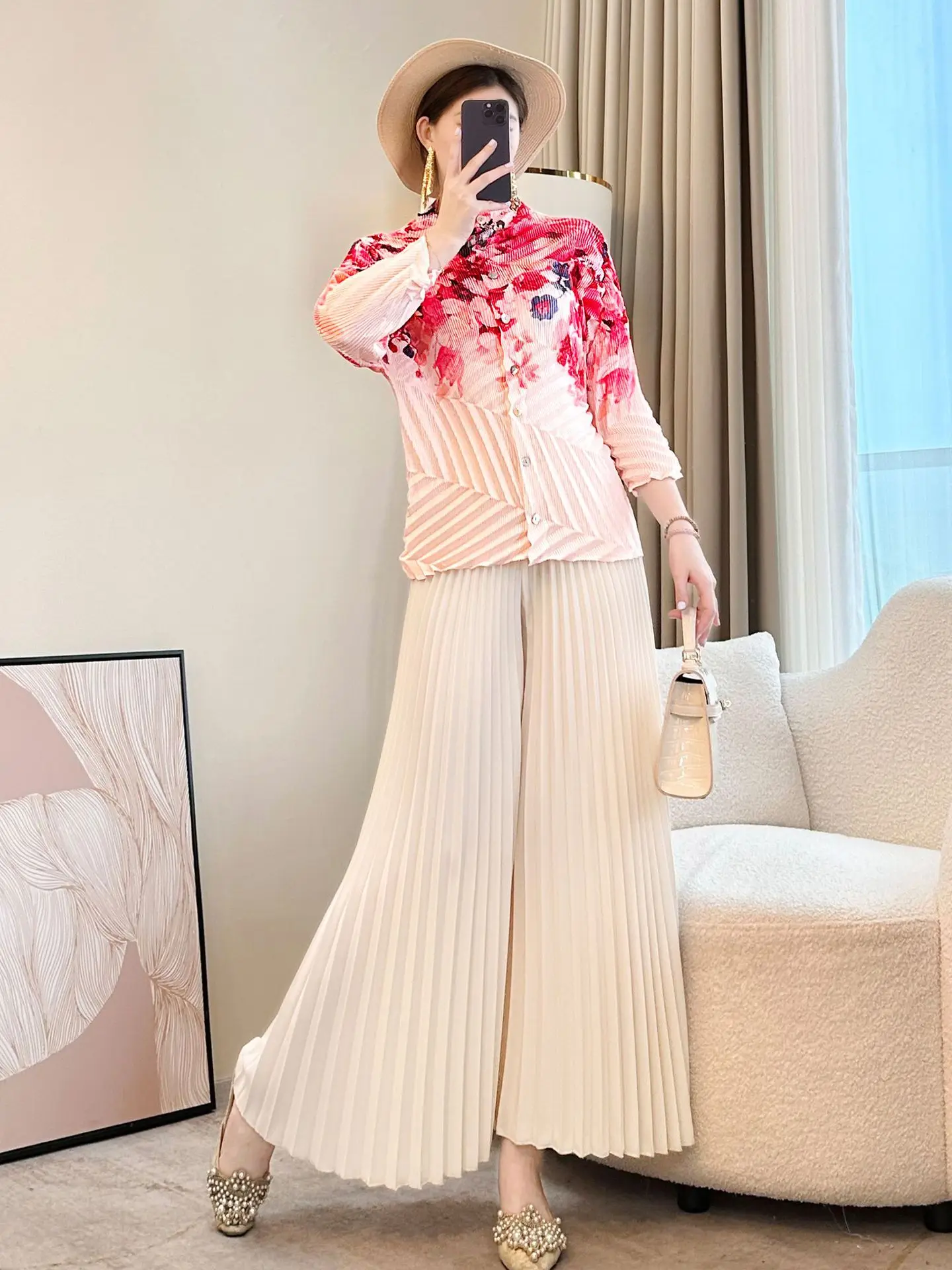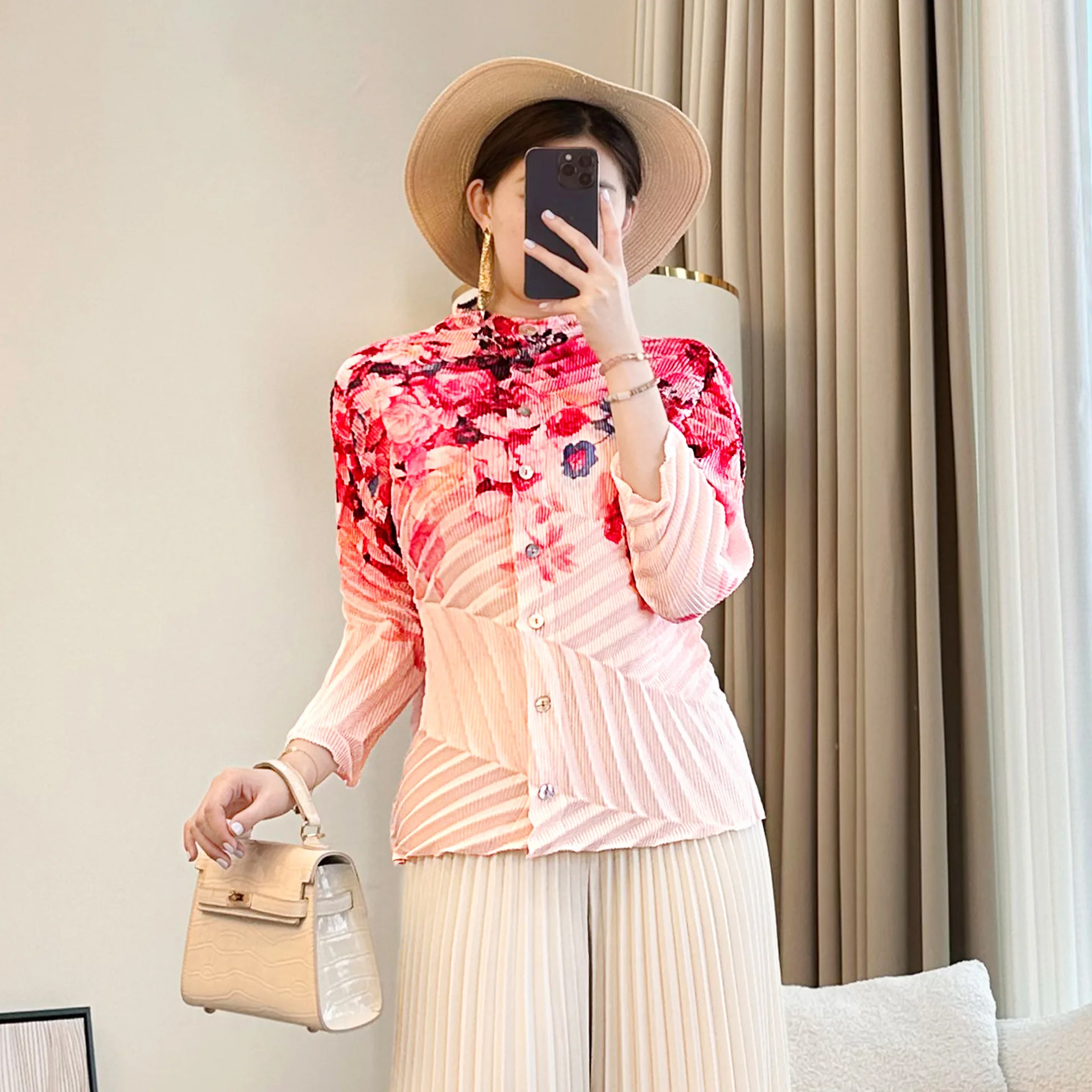 2026 Spring Summer Women's French Printed Pleated Top Loose Slimming Age-Reducing T-Shirt Knitted Fabric Anti-Pilling Feature