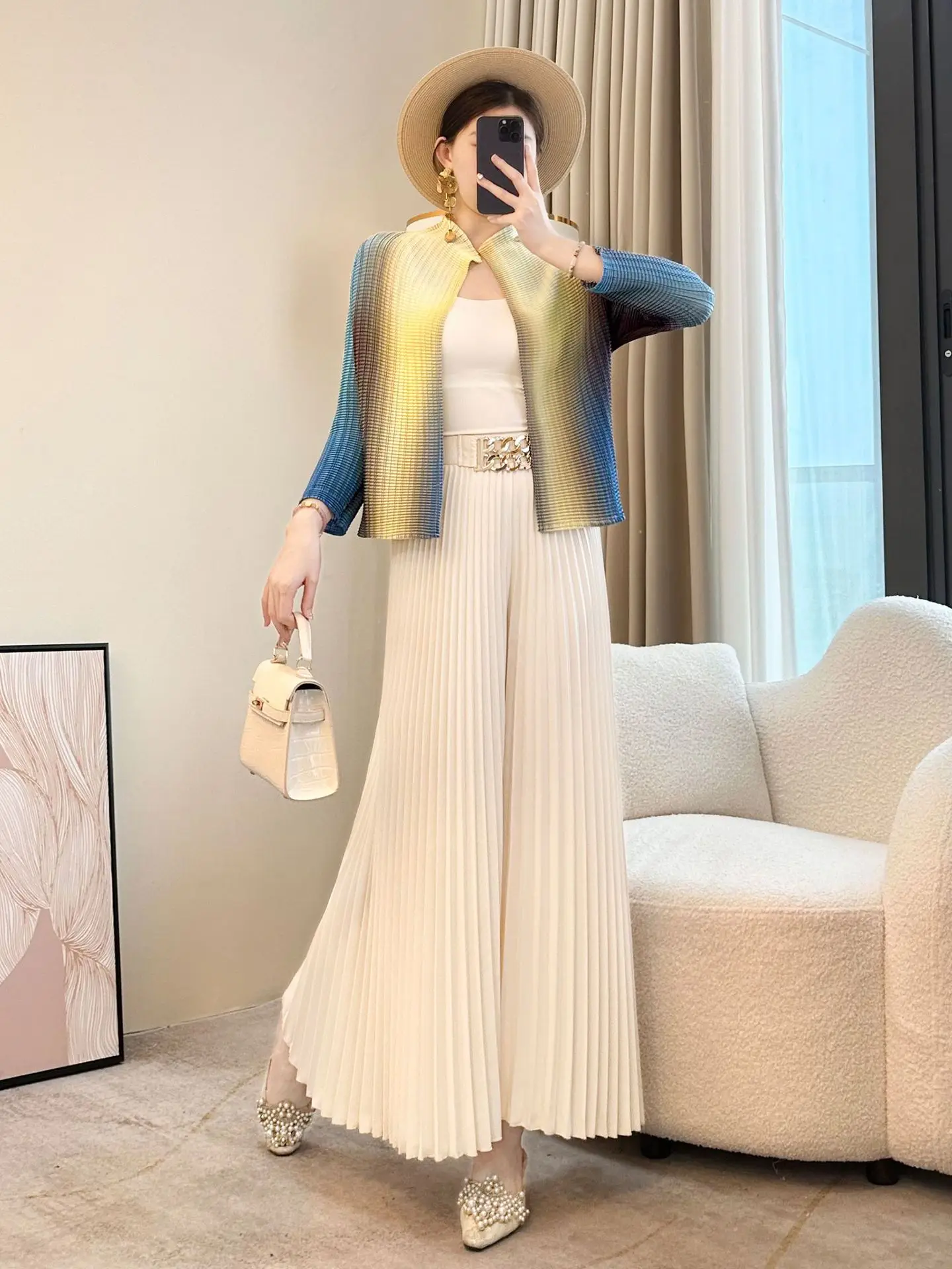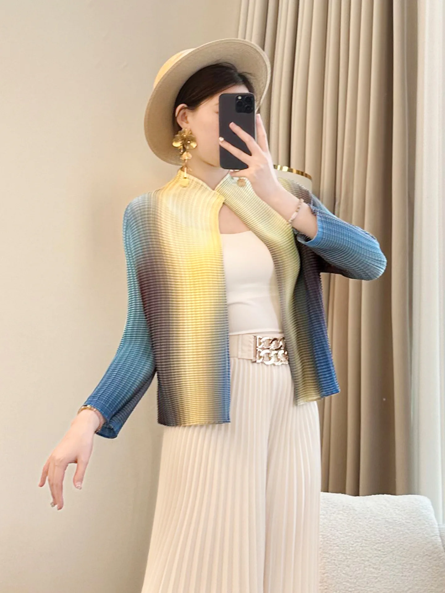 Women's Miyake Style Pleated Cardigan Short Coat Loose All-Match Shirt for Spring Summer Casual Rabbit Stand Sunscreen New