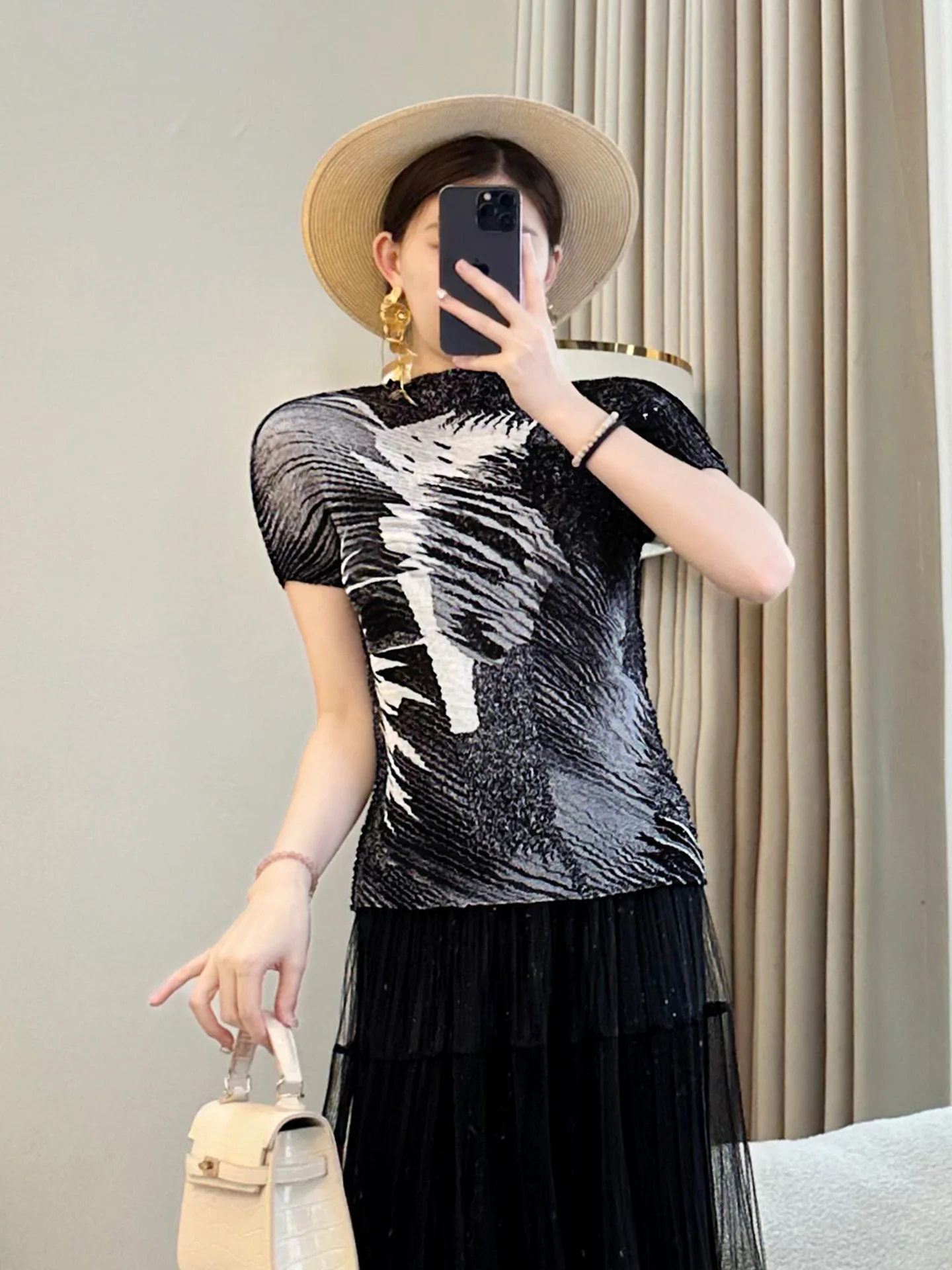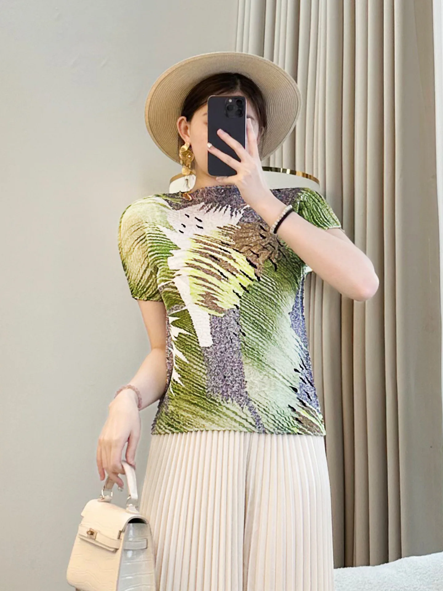 High-End Miyake Green Chiffon Crewneck T-Shirt for Women Elegant Pleated Loose All-Match Slim-Fit Short-Sleeve Top for Spring