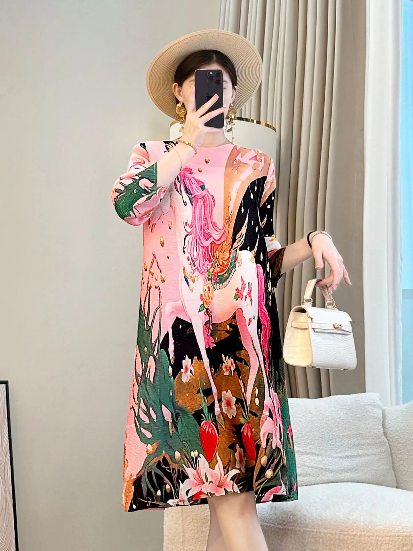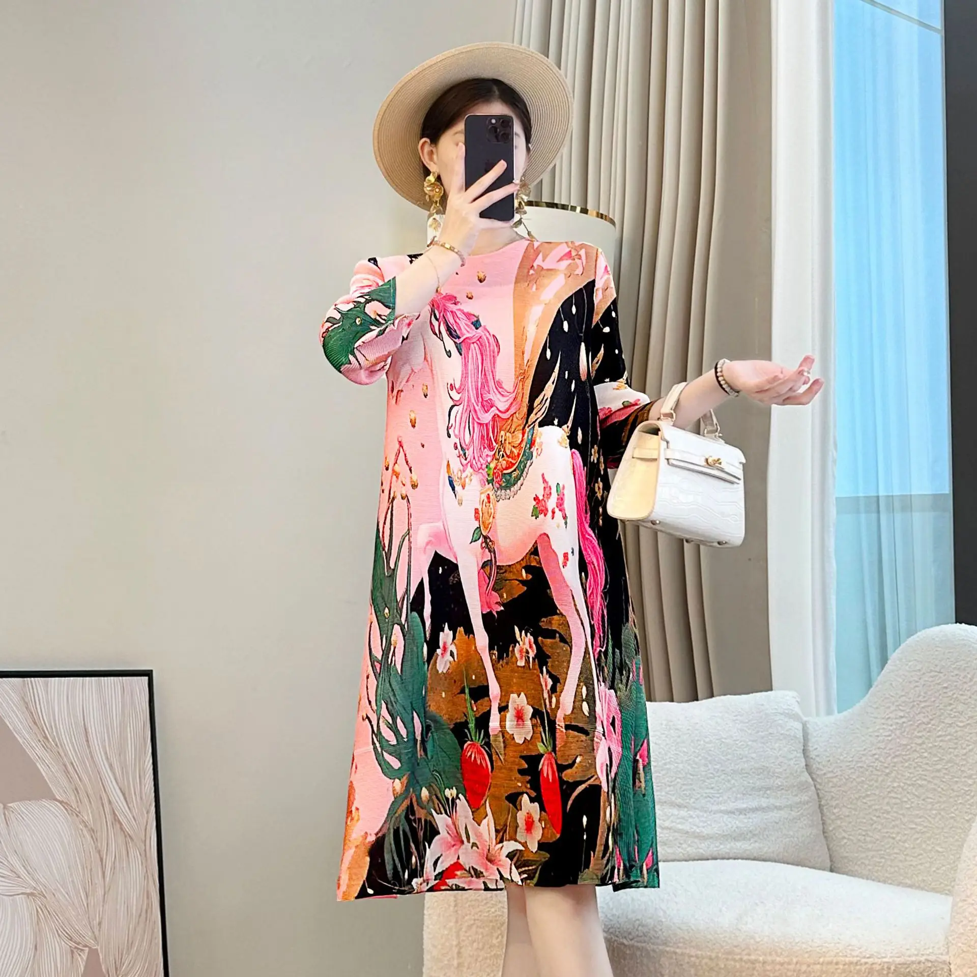 2026 Summer High-End Printed Mother Dress Slim Pleated Midi Length Woven Natural Waistline Front Foreign Style Fashion Tempe