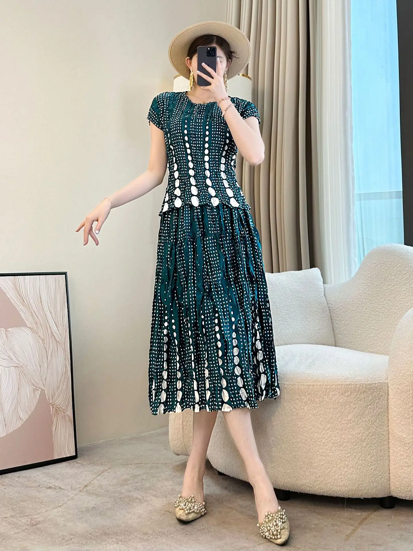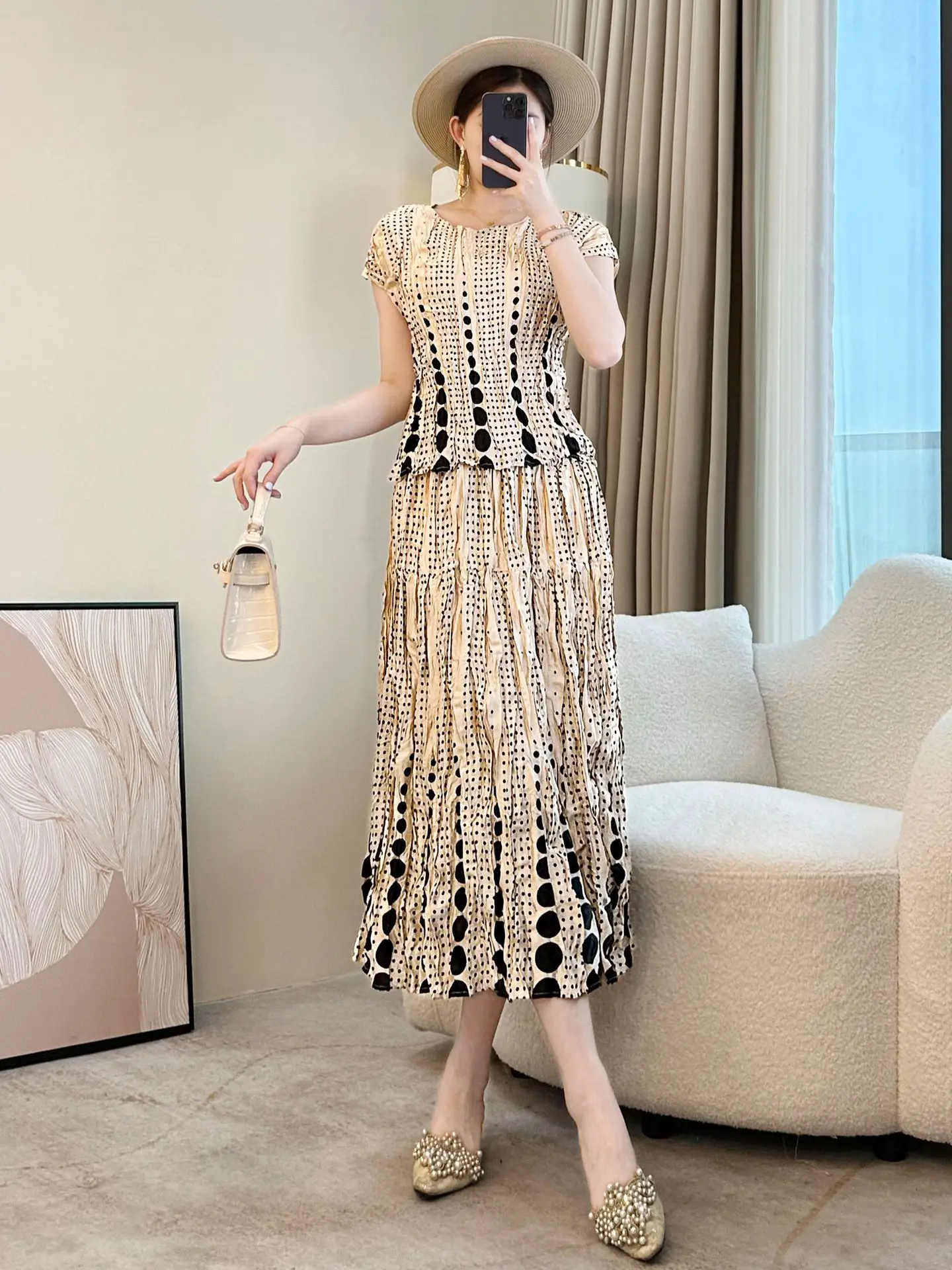2026 Summer New Women's Comfortable All-Season Casual Pleated Skirt Set Daily Wear Long Lace Dot Printed Chiffon Fashionable
