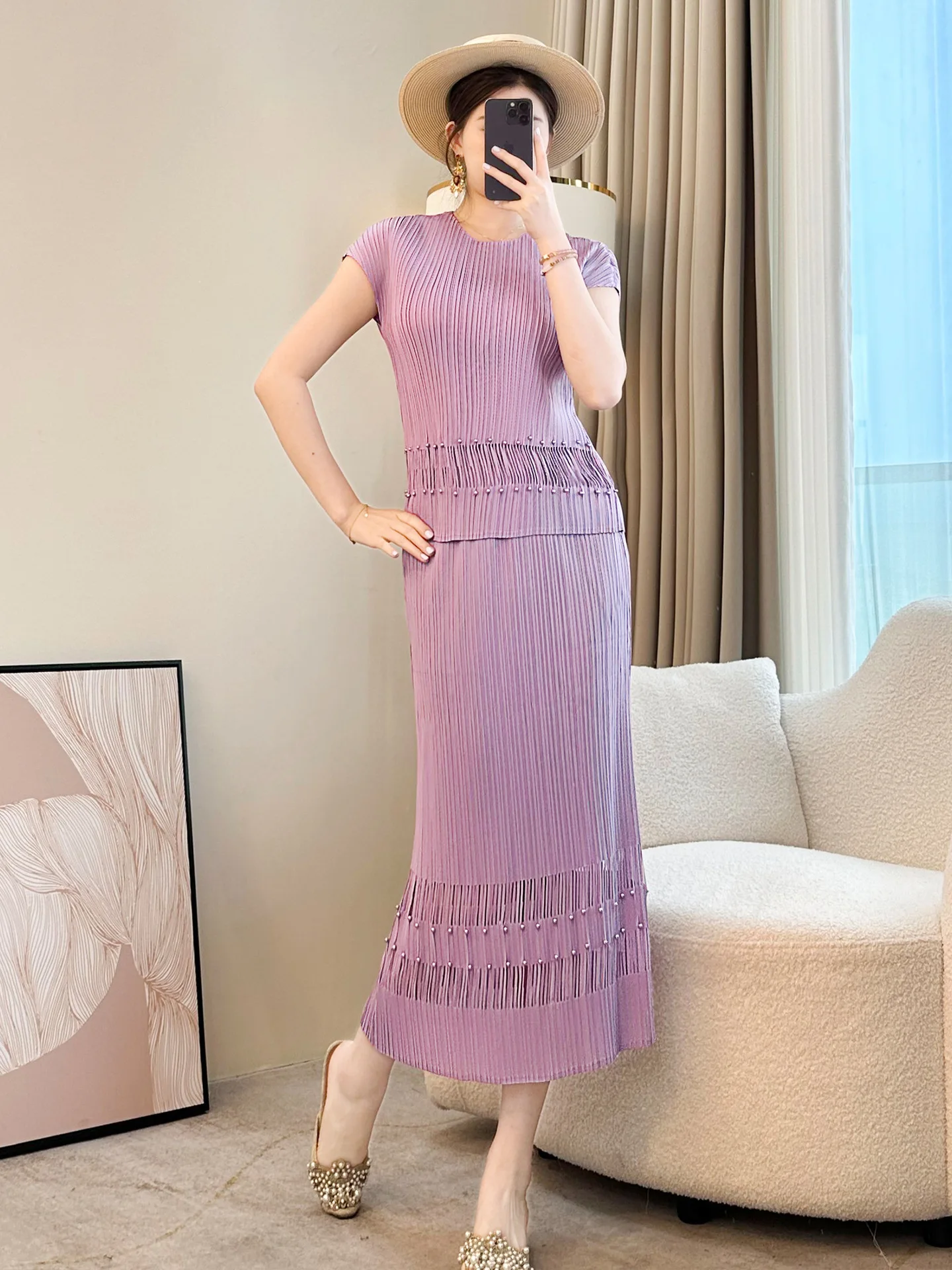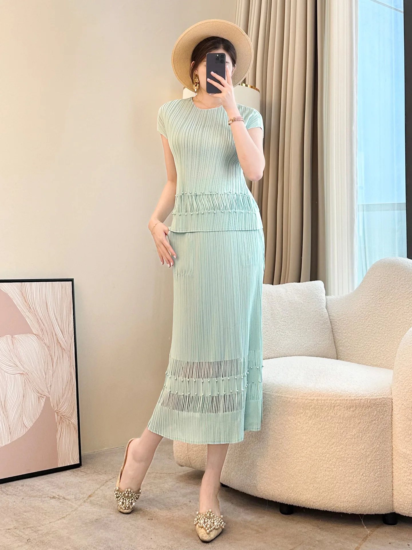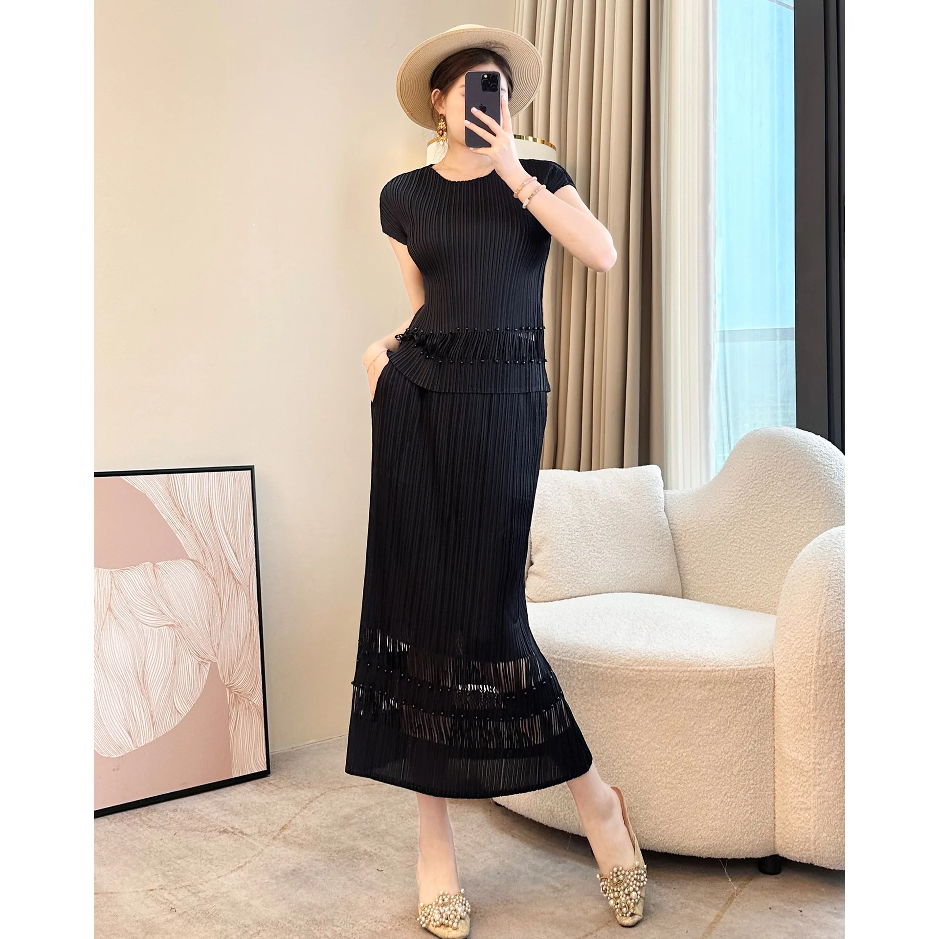 High-End Casual Western Style Two-Piece Suit New Summer Fashion Pleated Black Suit Short Sleeve Top Pleated Skirt Solid Pattern