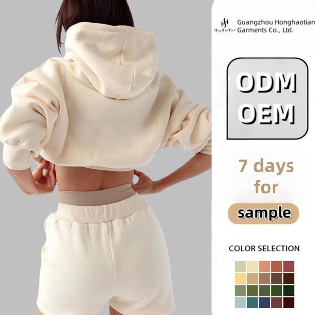 ODM Custom Women Two Pieces Outfits Street Wear Pullover Blank Cropped Hoodie With Short Sweatpants Women Sets Sports Outfit