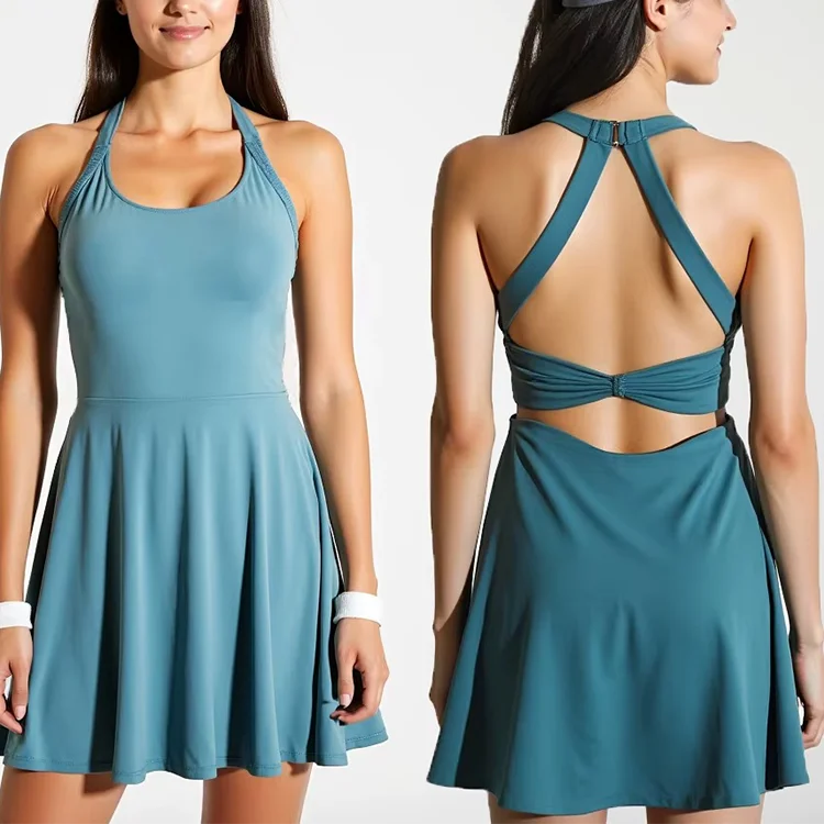 Quick Dry Pleated Workout Tennis Skirt Outfit Women Gym Fitness Wear Back Cross Yoga Tennis Dress With Built in Shorts