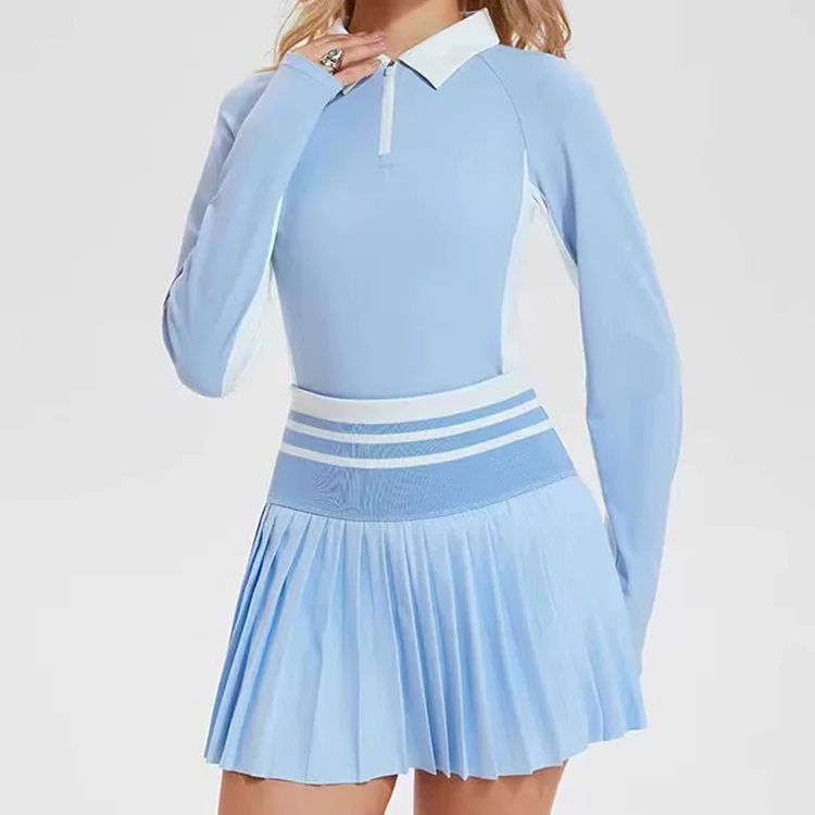 Custom Women's Quick Dry Tennis Skirt Sets Breathable Fitness Long Sleeve Polo T-Shirt Cycling Running Dress with Zipper