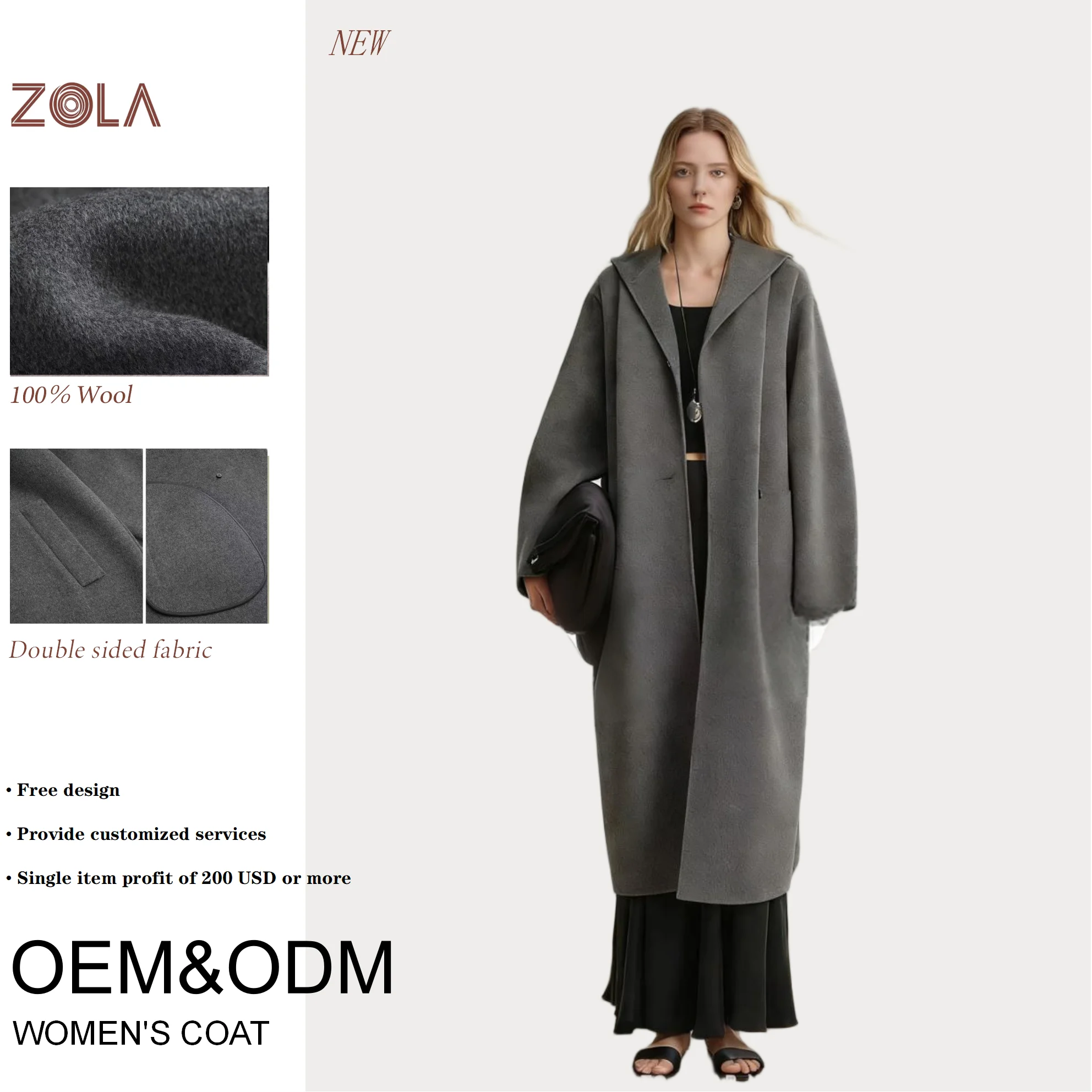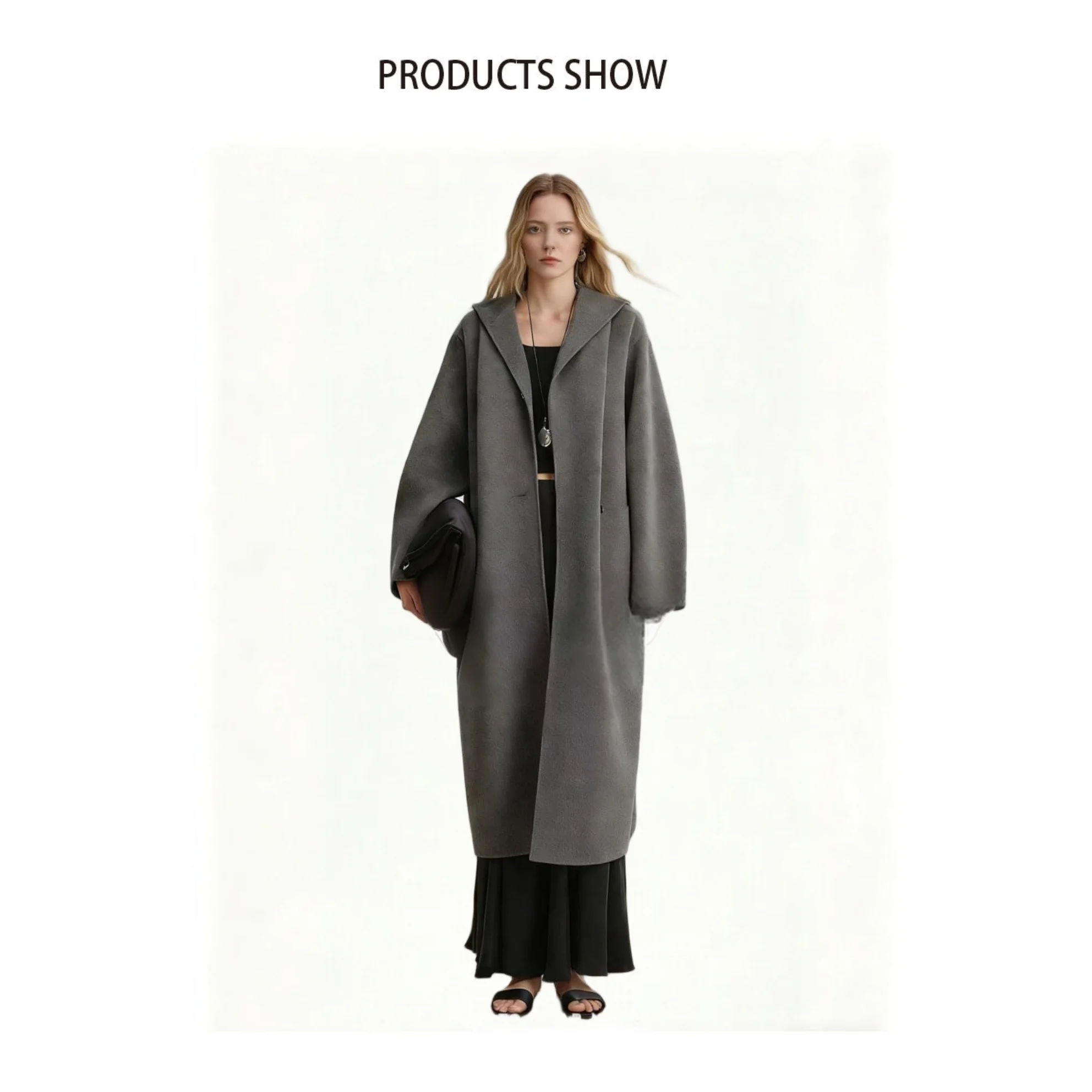 OEM&ODM Factory Price Soft 100% Wool Double Sided Oversized Charcoal Gray Women's Trendy Warm Winter Coat