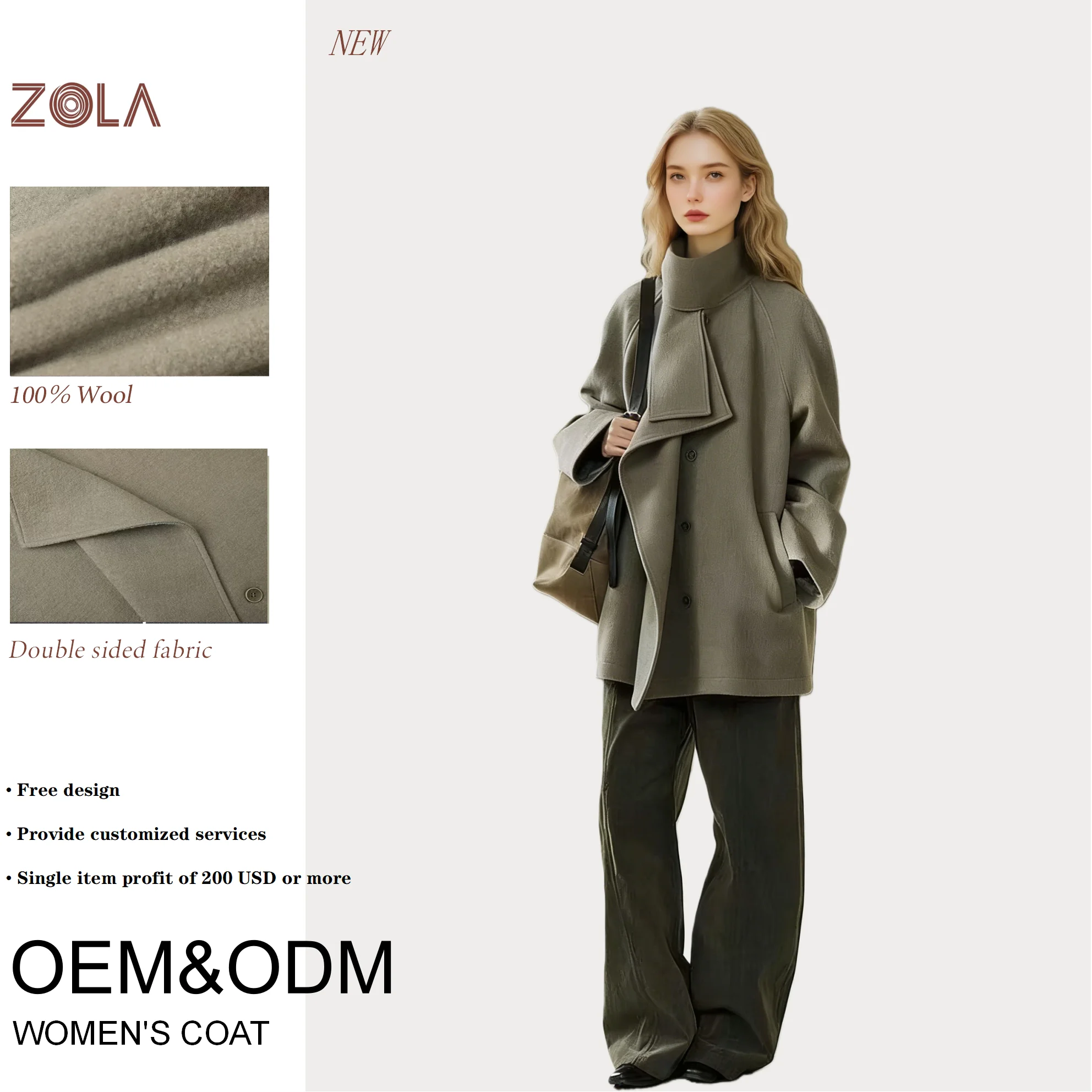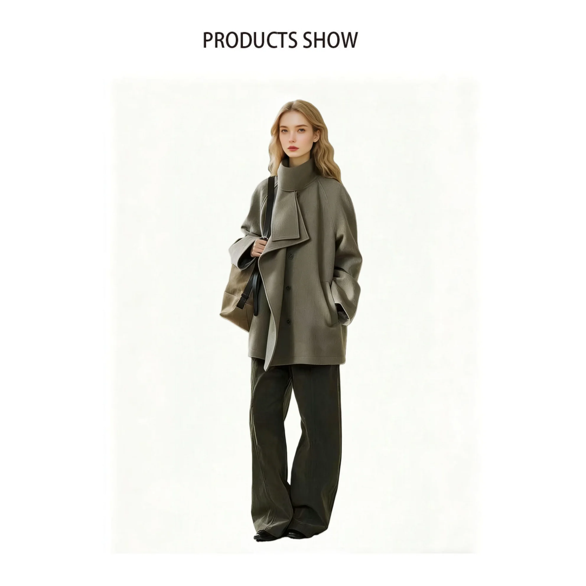 Factory Price 100% Wool Double Sided Warm Stand Collar Olive Green Women's Mid-length Thick Winter Coat (OEM ODM)
