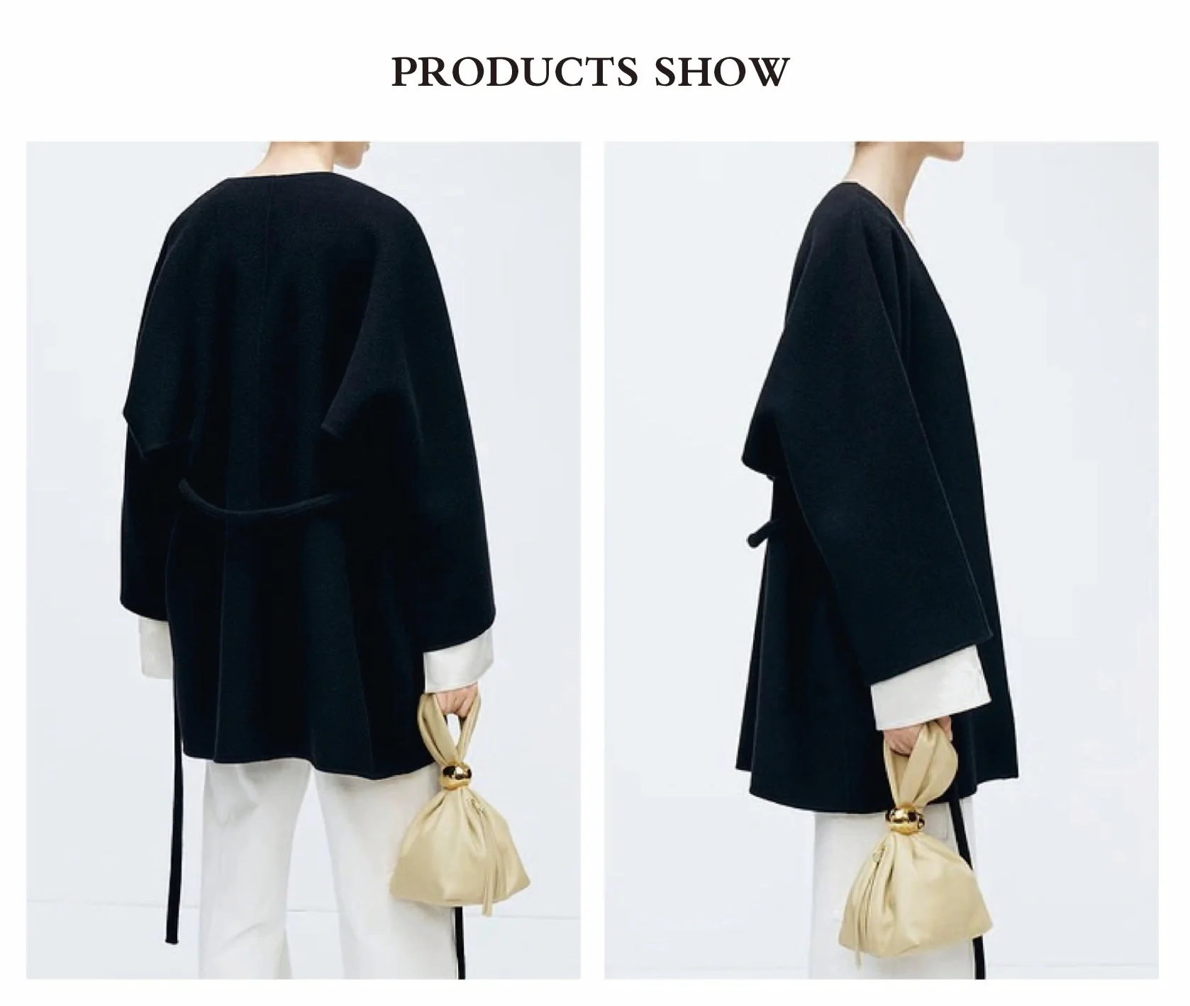 ODM Casual Women's Woolen V-neck Coat with Belt for Winter Handmade Breathable Black Outerwear Eco-friendly and Warm