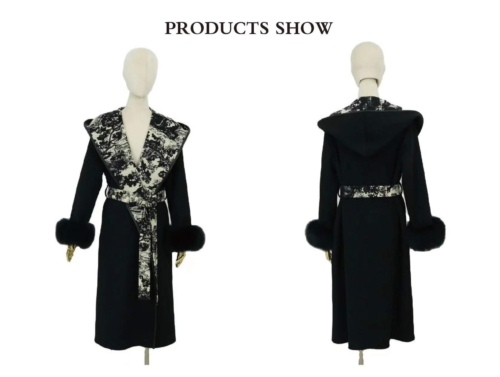 Custom Women's Oversized Woven Wool Furry Cuff Coat with Casual Hood Floral/Animal Print Long Black Overcoat for Winter
