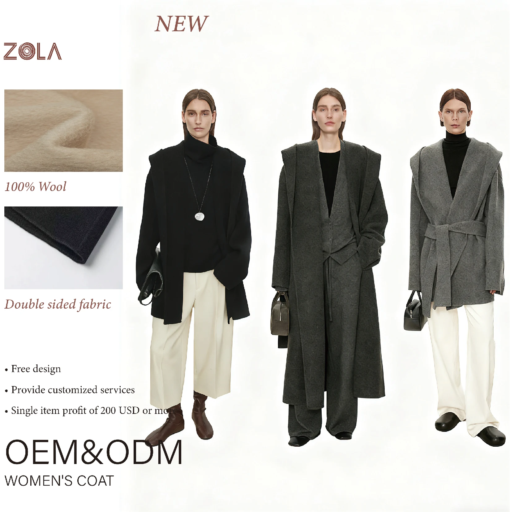 Women's Handmade Double Sided Woolen Hooded Casual Coat with Long Winter Design Keep Warm Detachable Belt