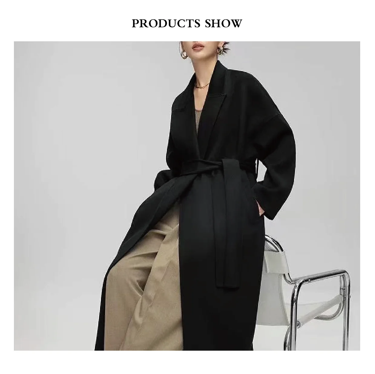25-year-old Winter New Minimalist Black Loose-fitting Wool Double-sided Belt Closure Soft Warm Long Coat for Ladies