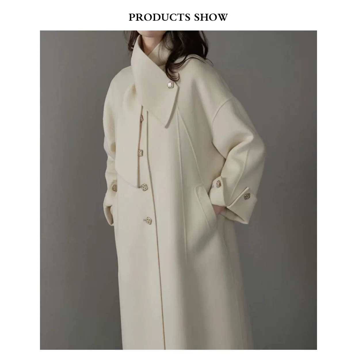 White Hepburn-style Double-sided 100% Wool Long Women's Winter Coat with Button Closure Woolen Fabric Warm & Soft Casual Style