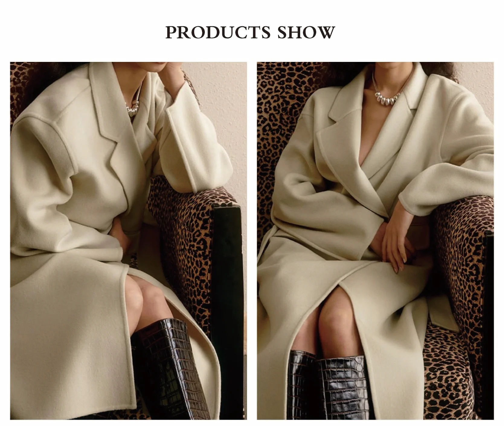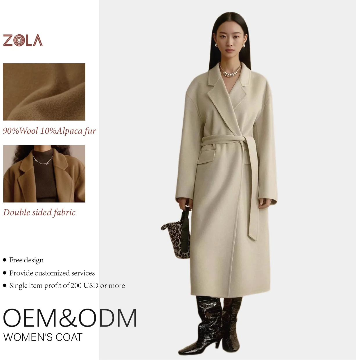 High Quality Long Length Winter Women's Jacket Coat Wool Alpaca Fur Blend Fabric with Turn Down Collar and Belt Closure