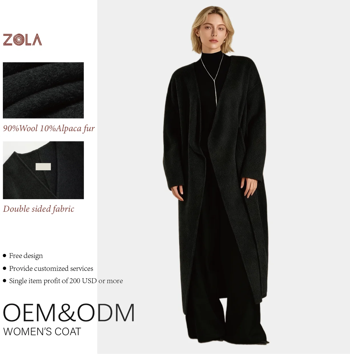 Women's Custom Logo Long Woolen Alpaca Fur Coat Breathable Belt Solid Color Slim Casual Style Winter Outerwear Handmade Cashmere