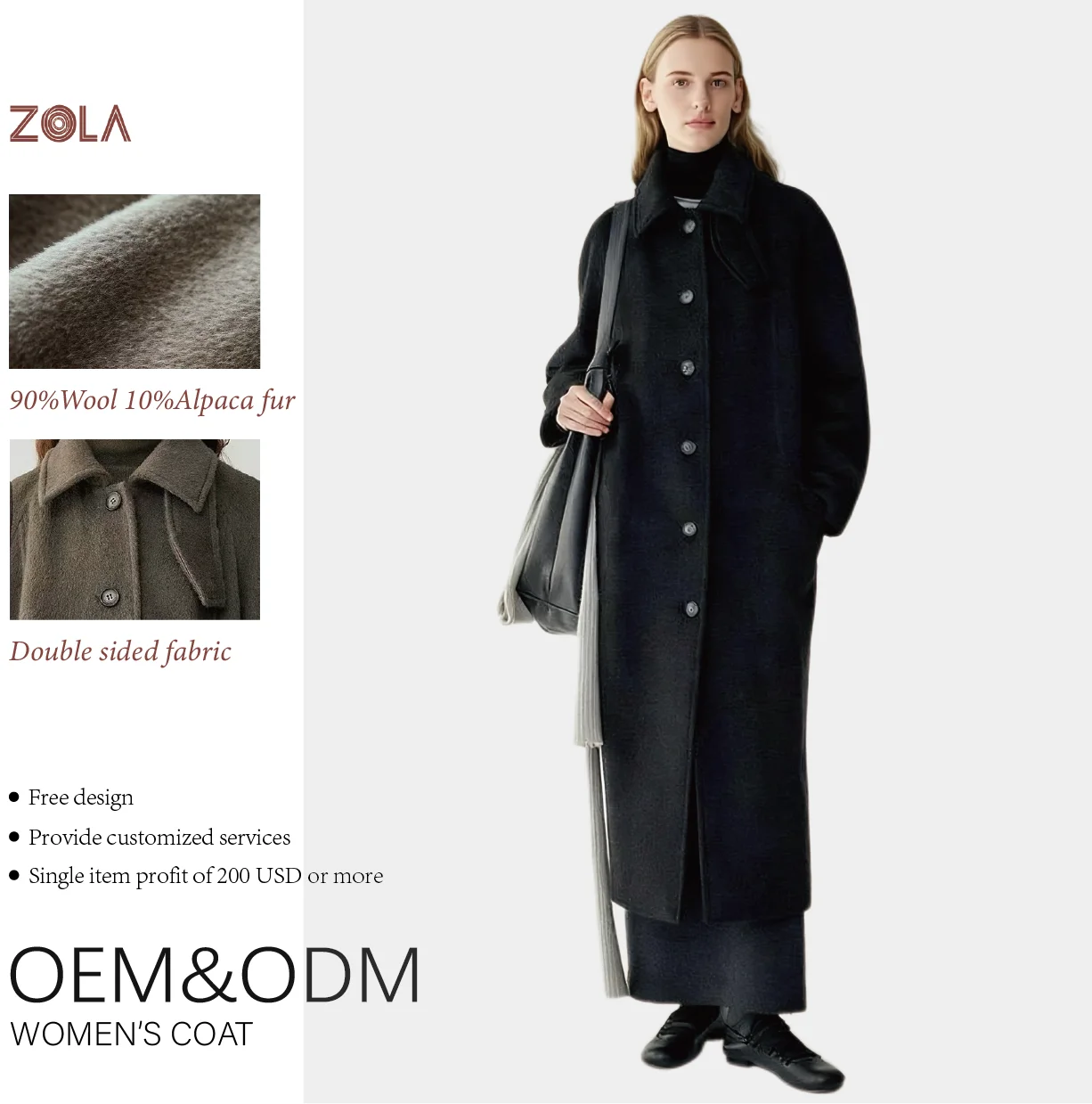 Black Long Casual Breathable Winter Outerwear Warm Women's Wool Alpaca Coat with Single Button