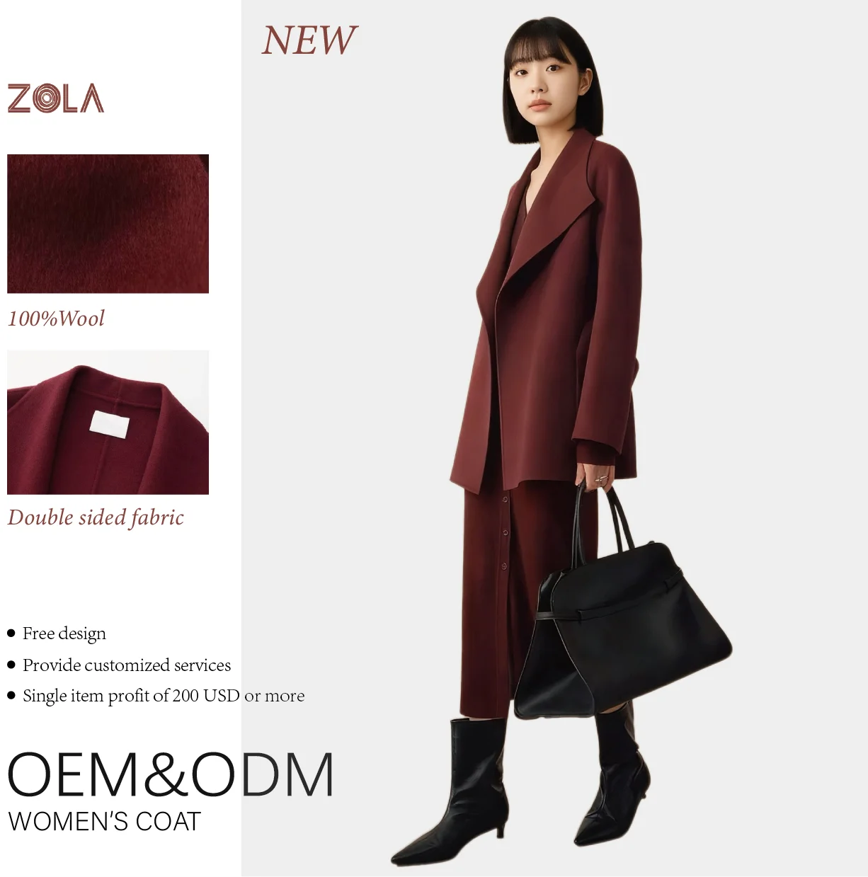 Handmade Woolen Coat for Office Lady High-End Double Sided Turn Down Collar Casual Belt Closure Customized Winter Woolen Coat