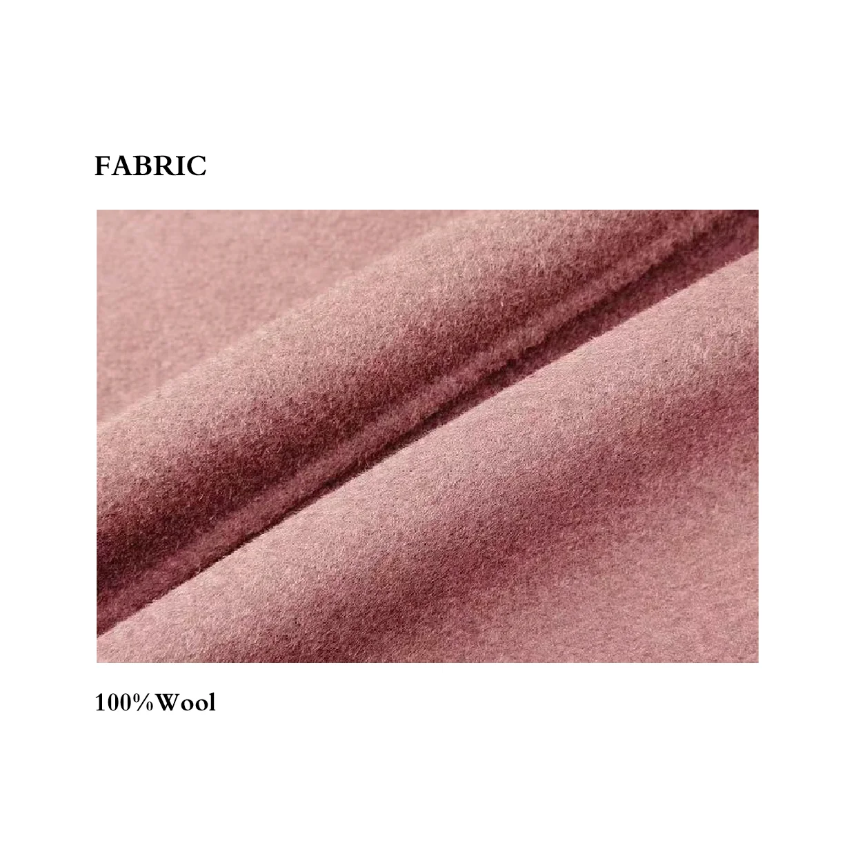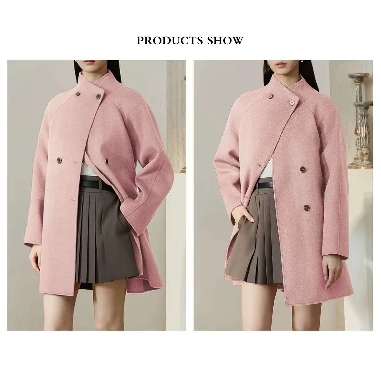 Pink Young Women's Casual Double Breasted Handmade Wool Coat with Stand Collar Winter Outerwear and Belt