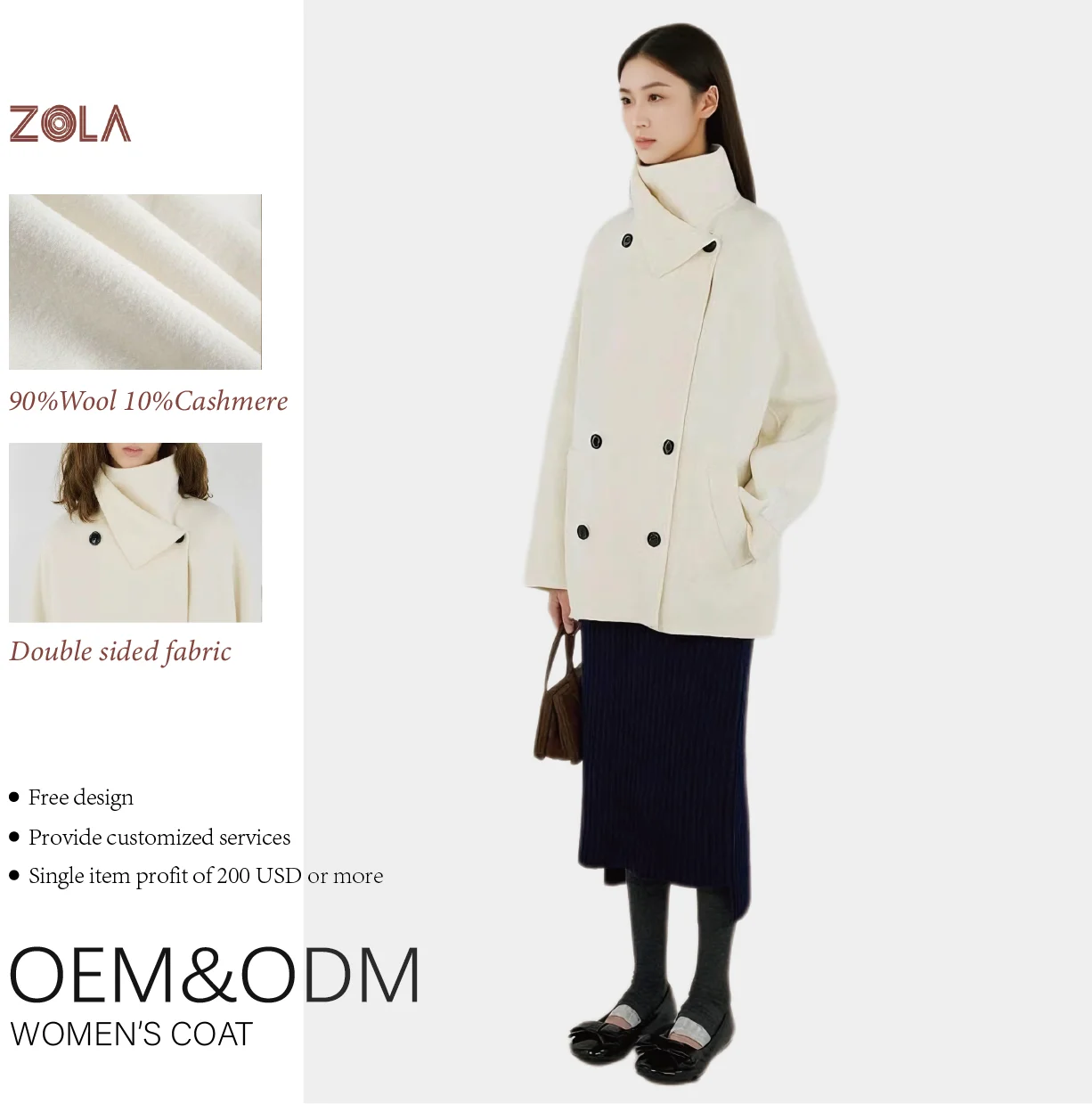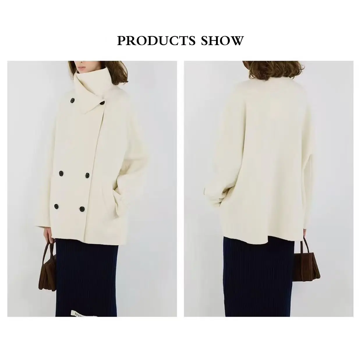 Women's High-End Eco-Friendly Casual Short Winter Coat Handmade Double-Breasted Cashmere Turtleneck Collar Soft Button