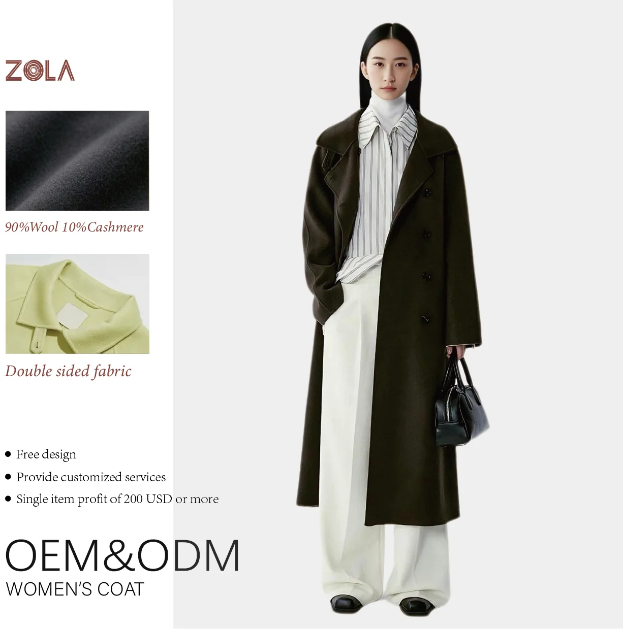 Handmade Women's Dark Brown Cashmere Coat Double Sided Winter Outerwear with Button Decoration for Office Lady