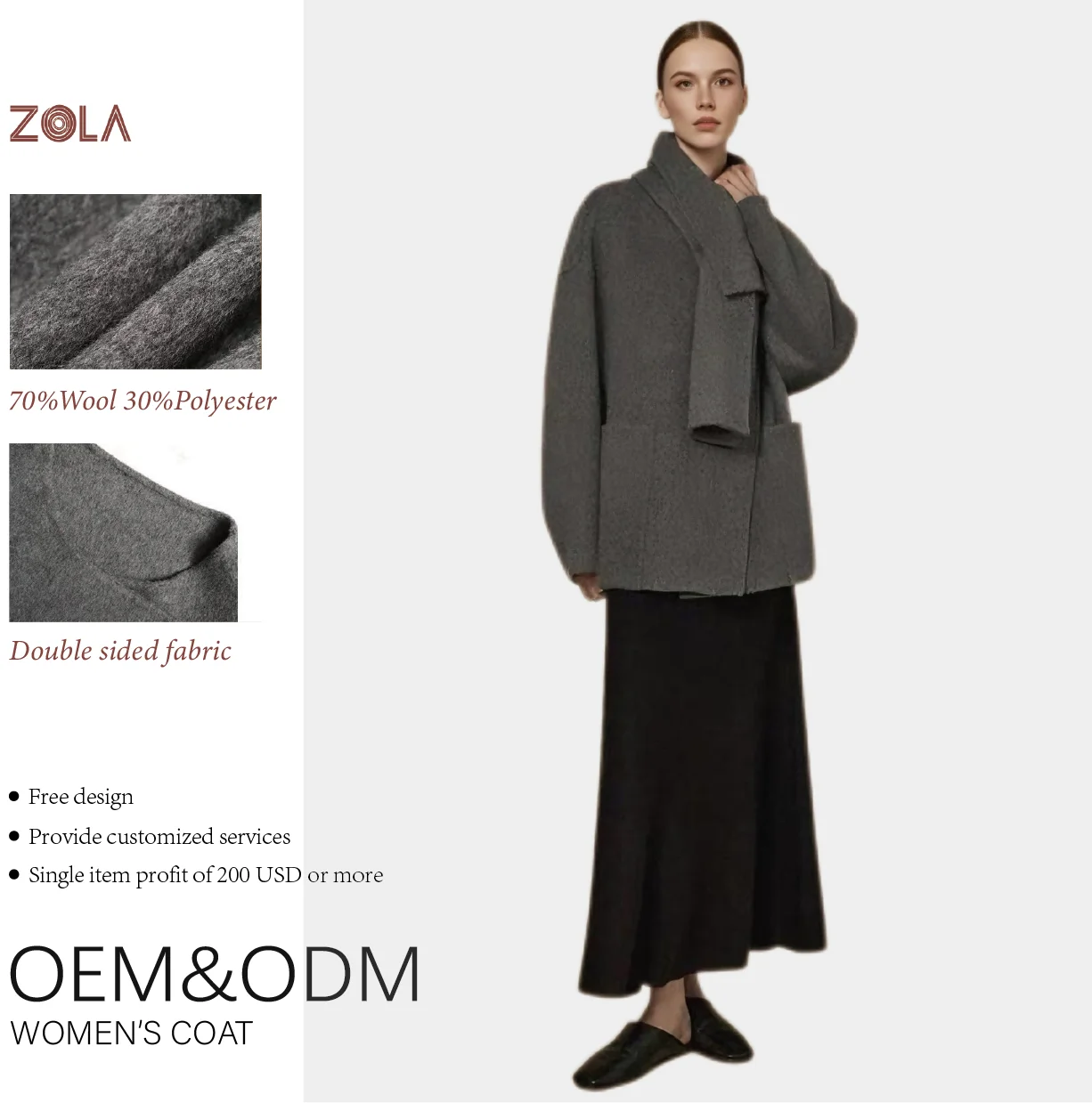 Fashion Style Casual Short Length Handmade Eco-Friendly Winter Woolen Coat Scarf Double Sided Button Closure 70% Wool 30%