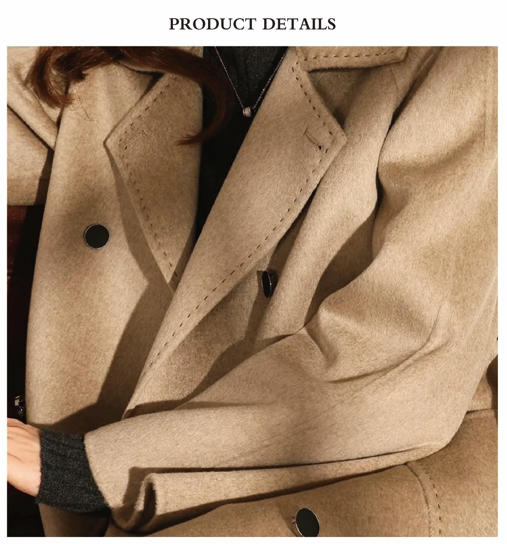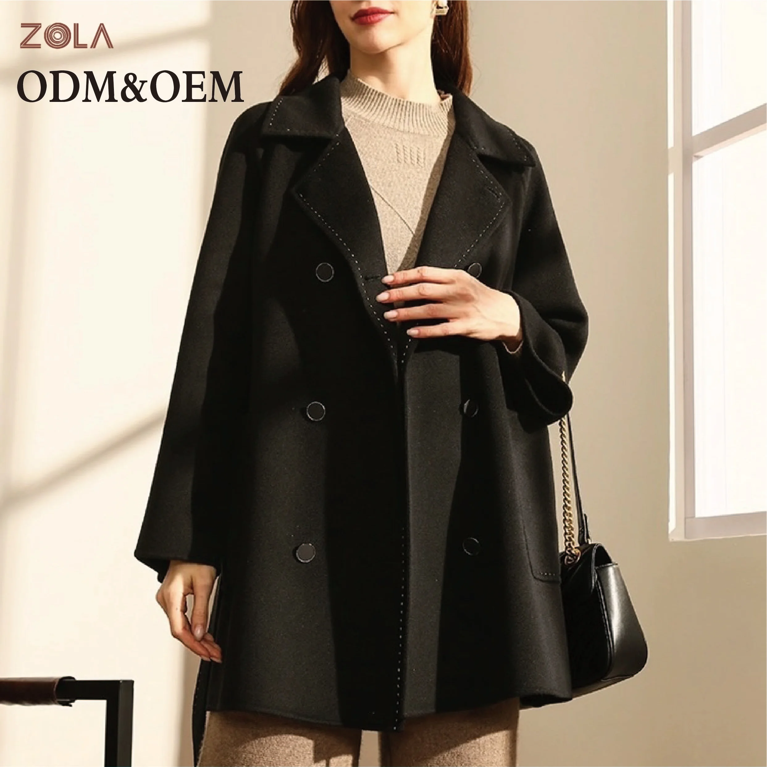 Solid Color Double Breasted Turn Down Collar Short Wool Coat Pocket Decorated with Belt