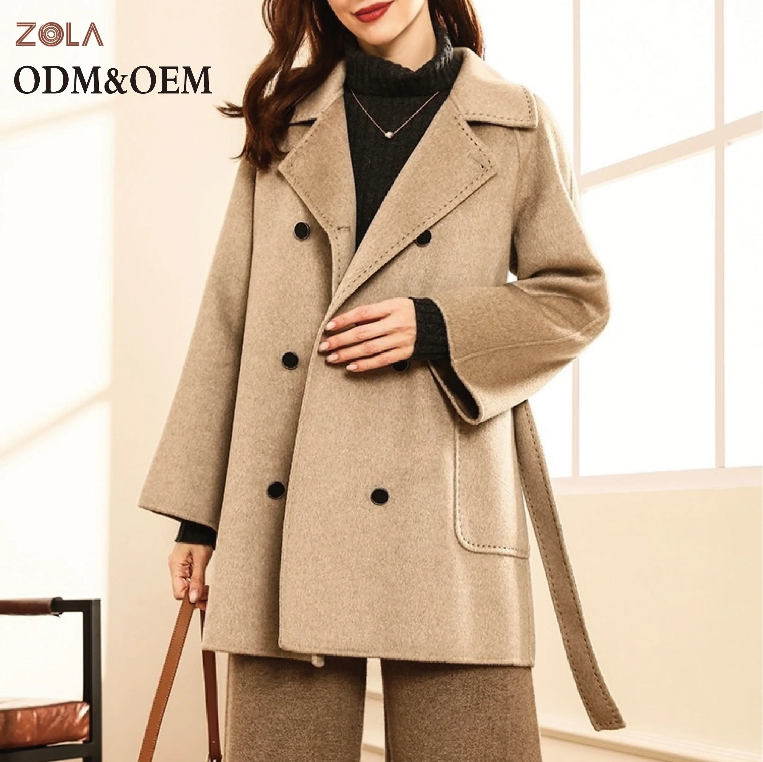 Wholesale Winter Clothing Double Breasted Short Wool Coat with Belt Plain Dyed Turn Down Collar