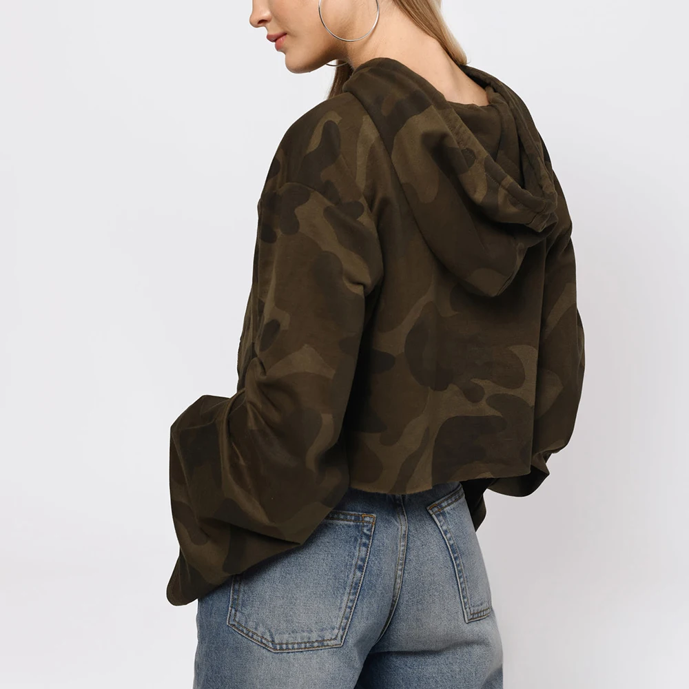OEM Factory Manufacture Women's Cropped Camo Raw Hem Hoodie Custom Logo Printed Streetwear Sweatshirt