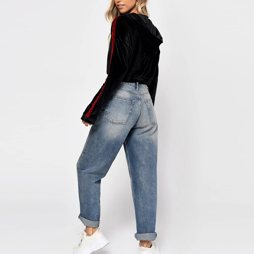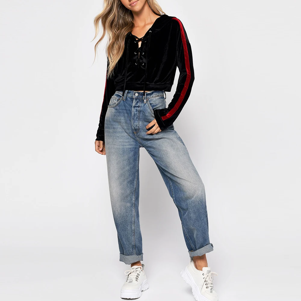 OEM Manufacturer's Custom Crop Velvet Pullover Hoodie Women's Vintage New Design with Side Stripes Wholesale