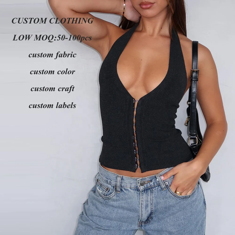 Factory Summer New Design Deep v Neck Women Black tank Tops Sexy Backless Ladies Sleeveless Ribbed tank Top