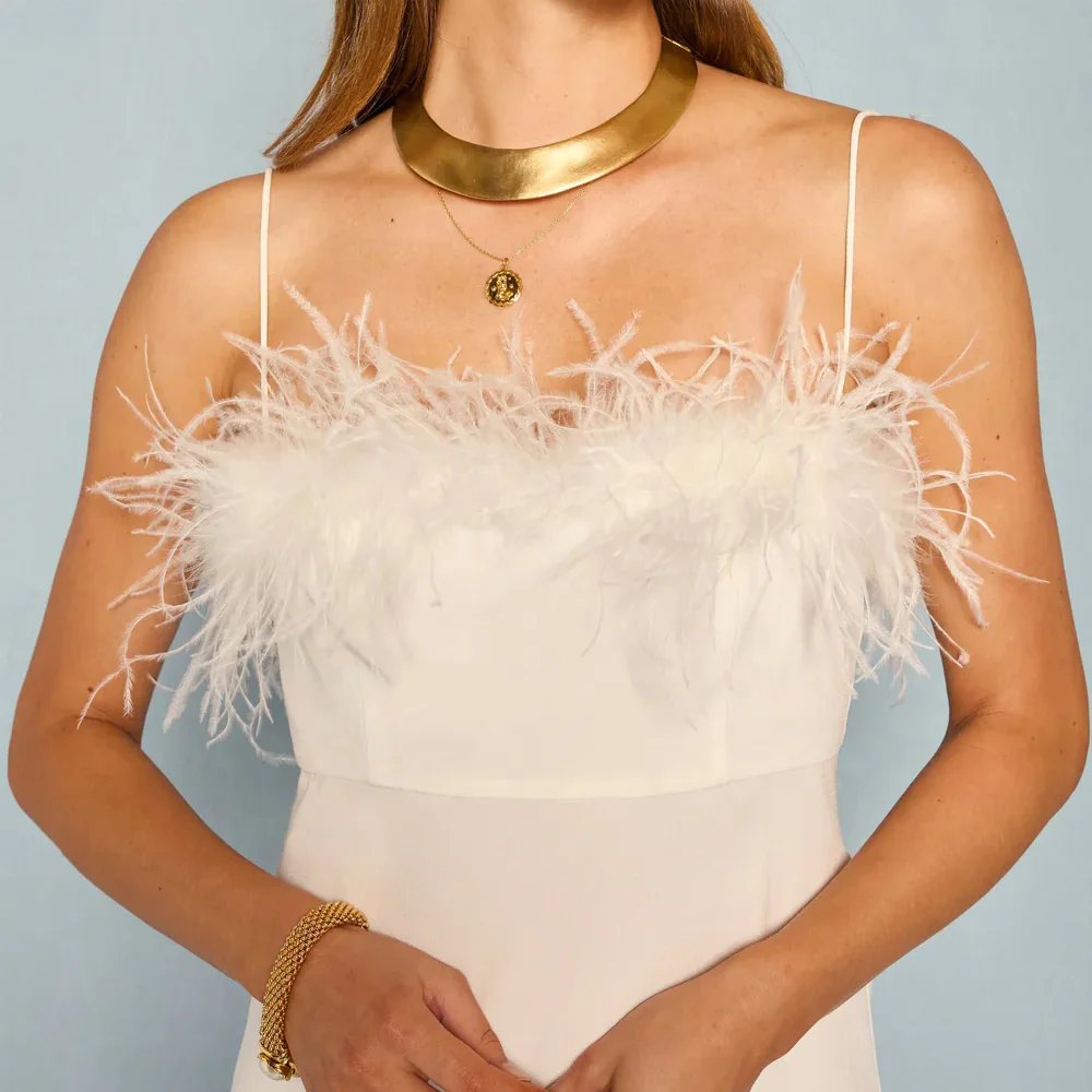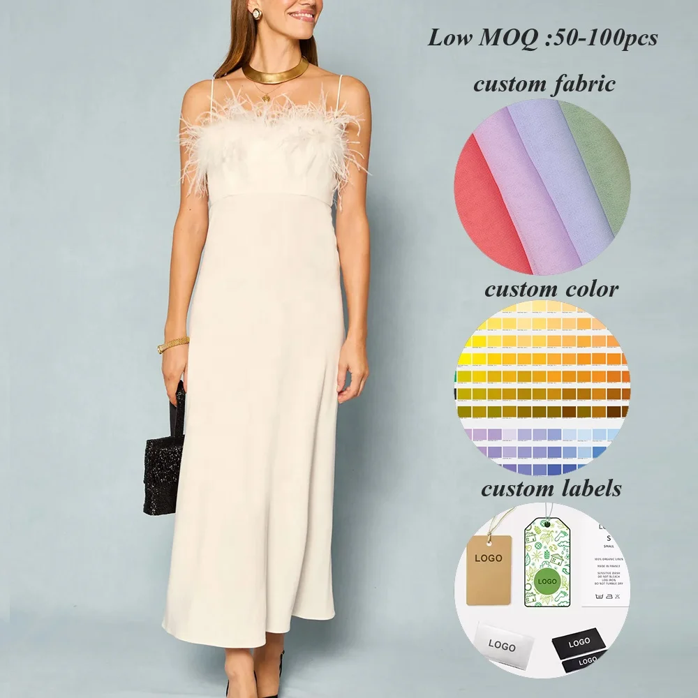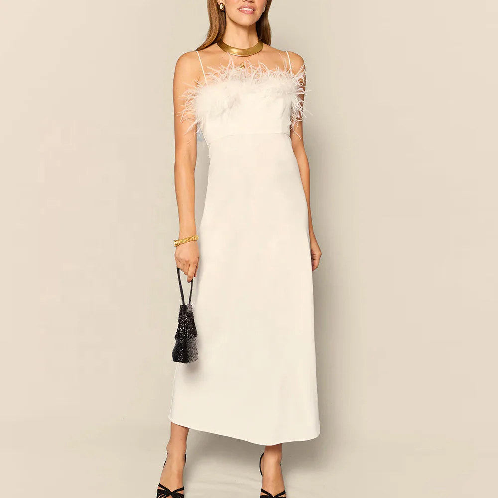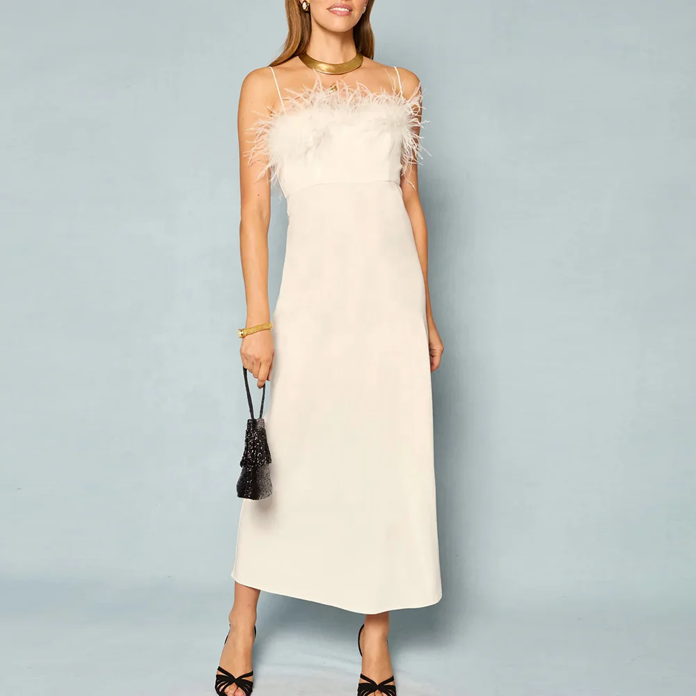 Factory One Stop Elegant Long Dresses Women Feather Neck Spaghetti Straps Evening Party Dress