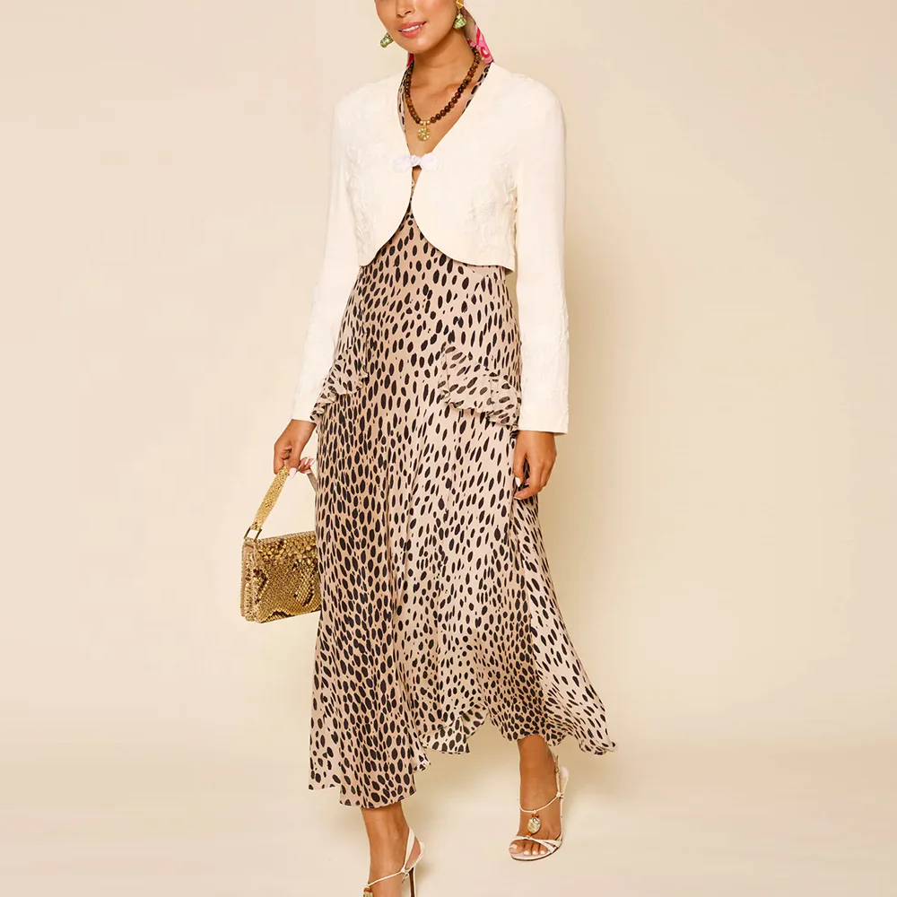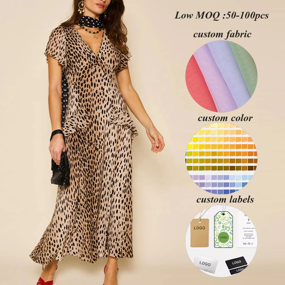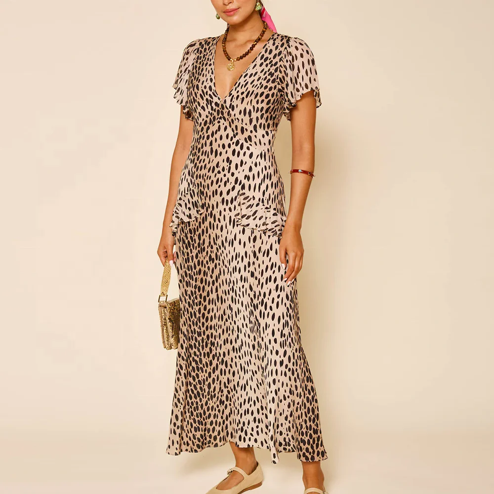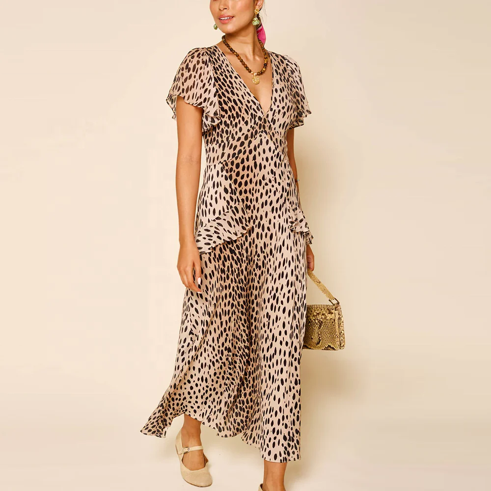 Factory Hot Selling Summer Short Sleeve Chiffon Dresses v Neck Women Ruffled Detail Leopard Printed Elegant Midi Dress