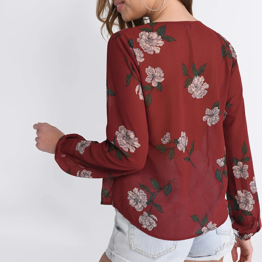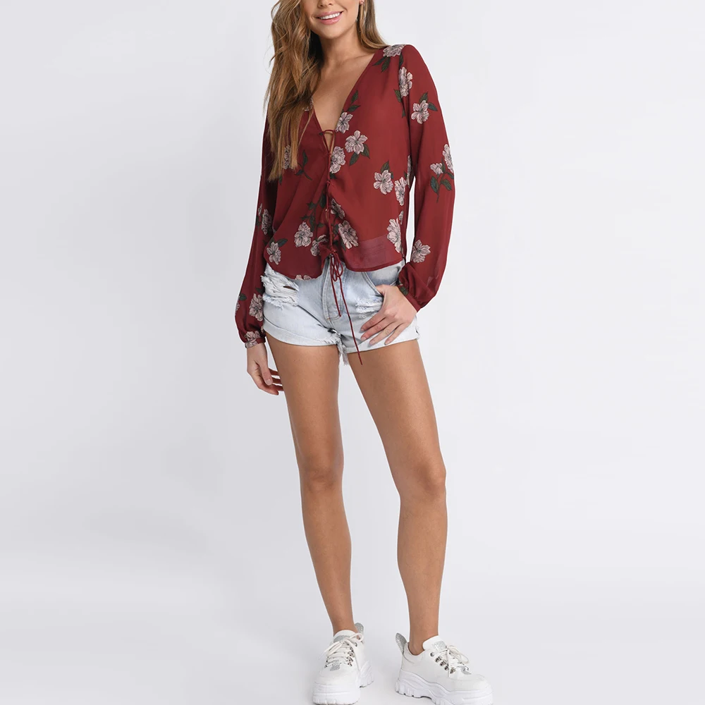 Summer New Design v Neck Ladies Long Sleeve Blouses Lace up Front Women Floral Printed Chiffon Shirts Blouses
