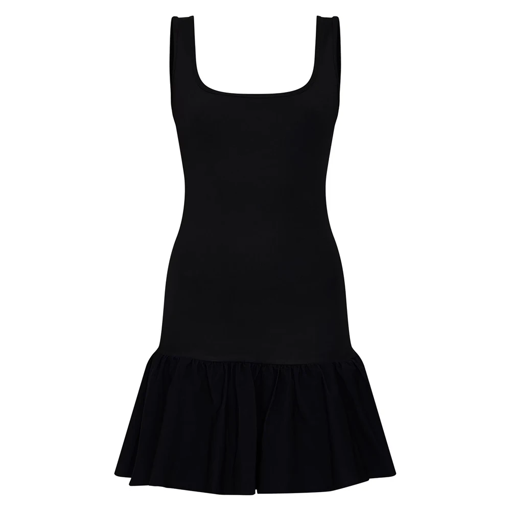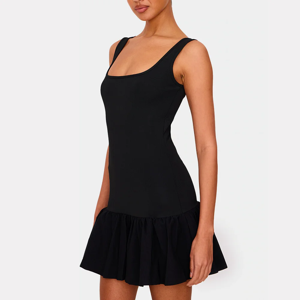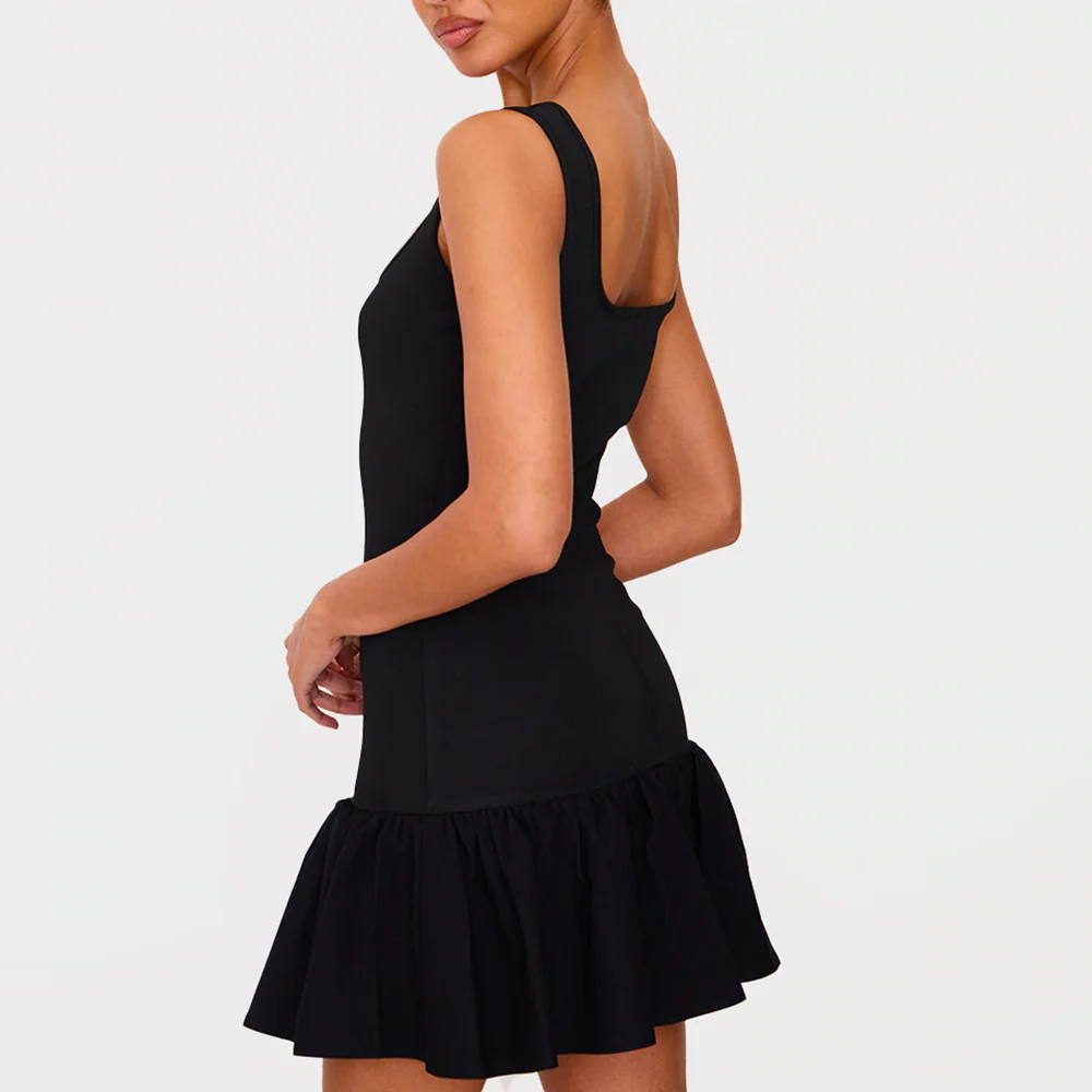 Custom Solid Black Sleeveless A-Line Mini Dress for Women Square Neck Tiered Design Dropped Waist Factory Direct Plain Dyed