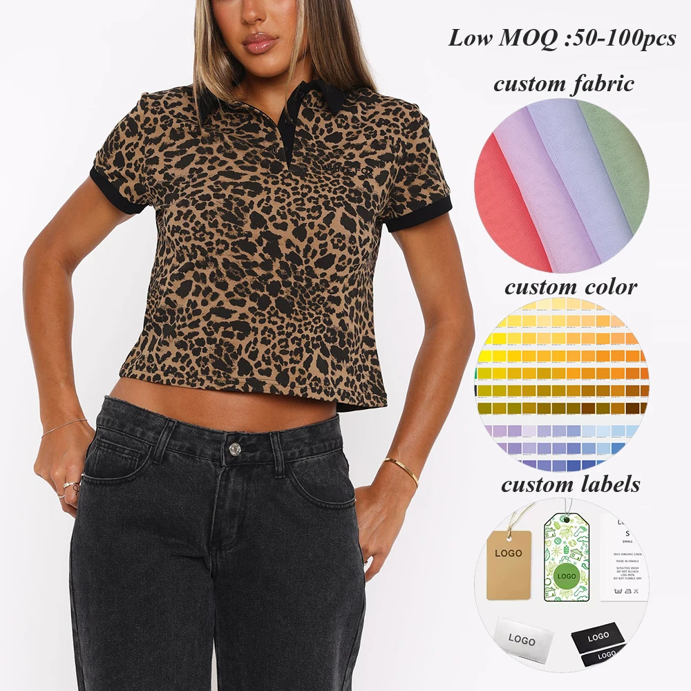 Manufacturer Oem Heavyweght Cotton Short Sleeve Polo t Shirt Women Custom logo Printed Crop Leopard t Shirt
