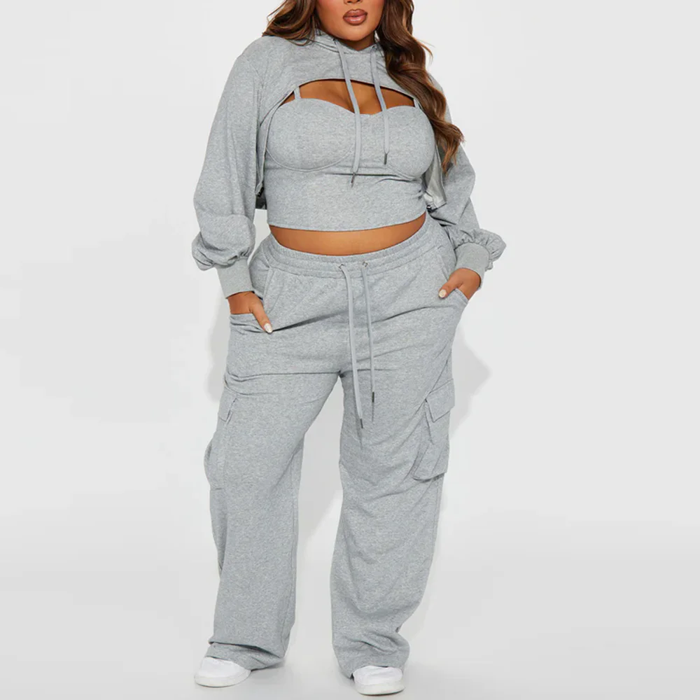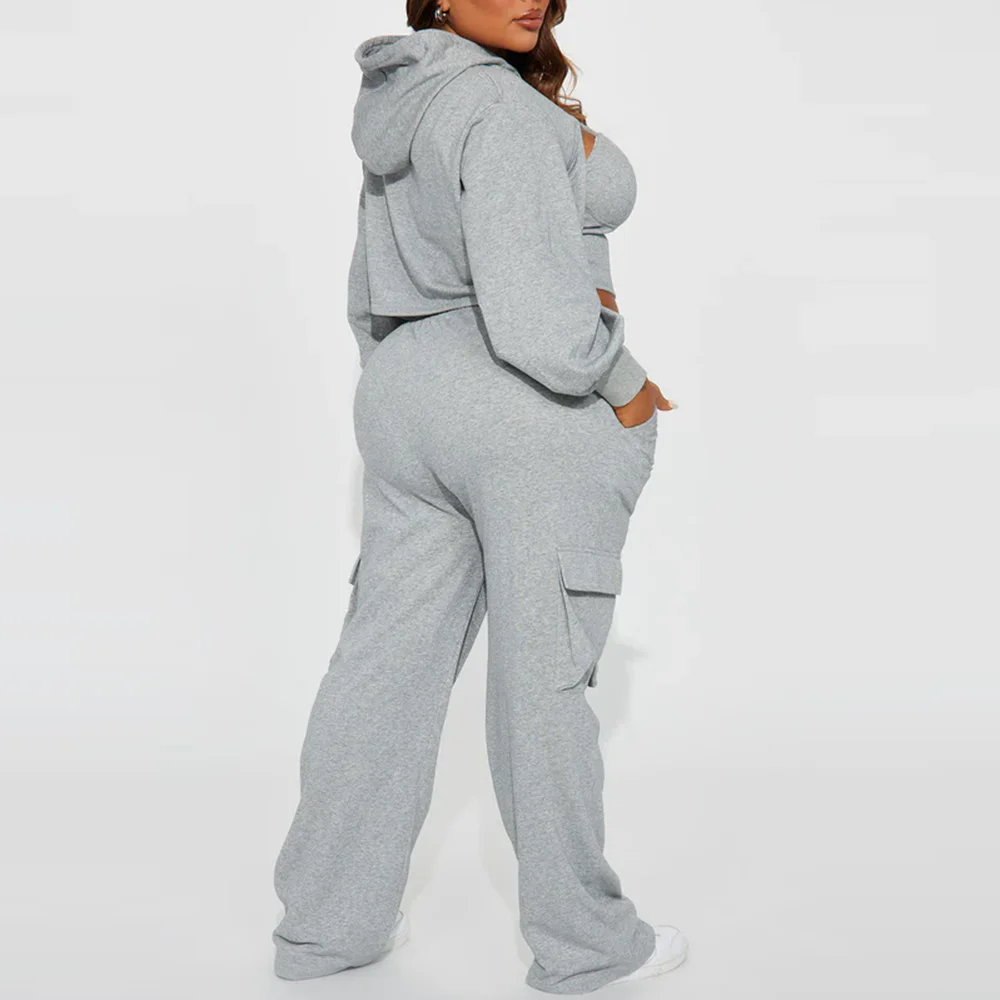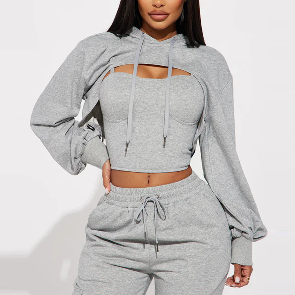 Oem Wholesale Thick Cotton Tracksuits Women Sexy Cropped Hoodie Jogger Sets Plain Color 3 Piece Sets Tracksuit Sweatsuits