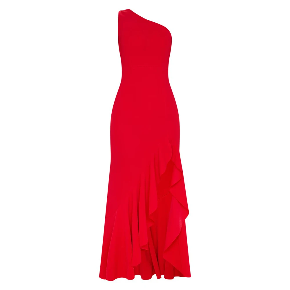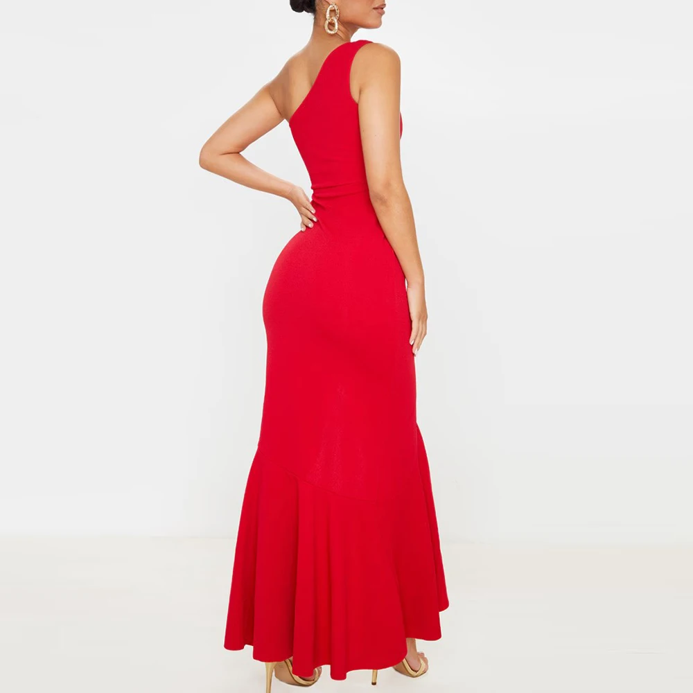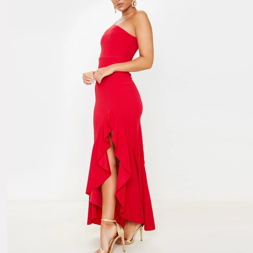Summer Hot Selling Slim Fit Ladies Elegant Slit Dresses Custom Asymmetrical One Shoulder Ruffled Bottom Women Bodycon Maxi Dress